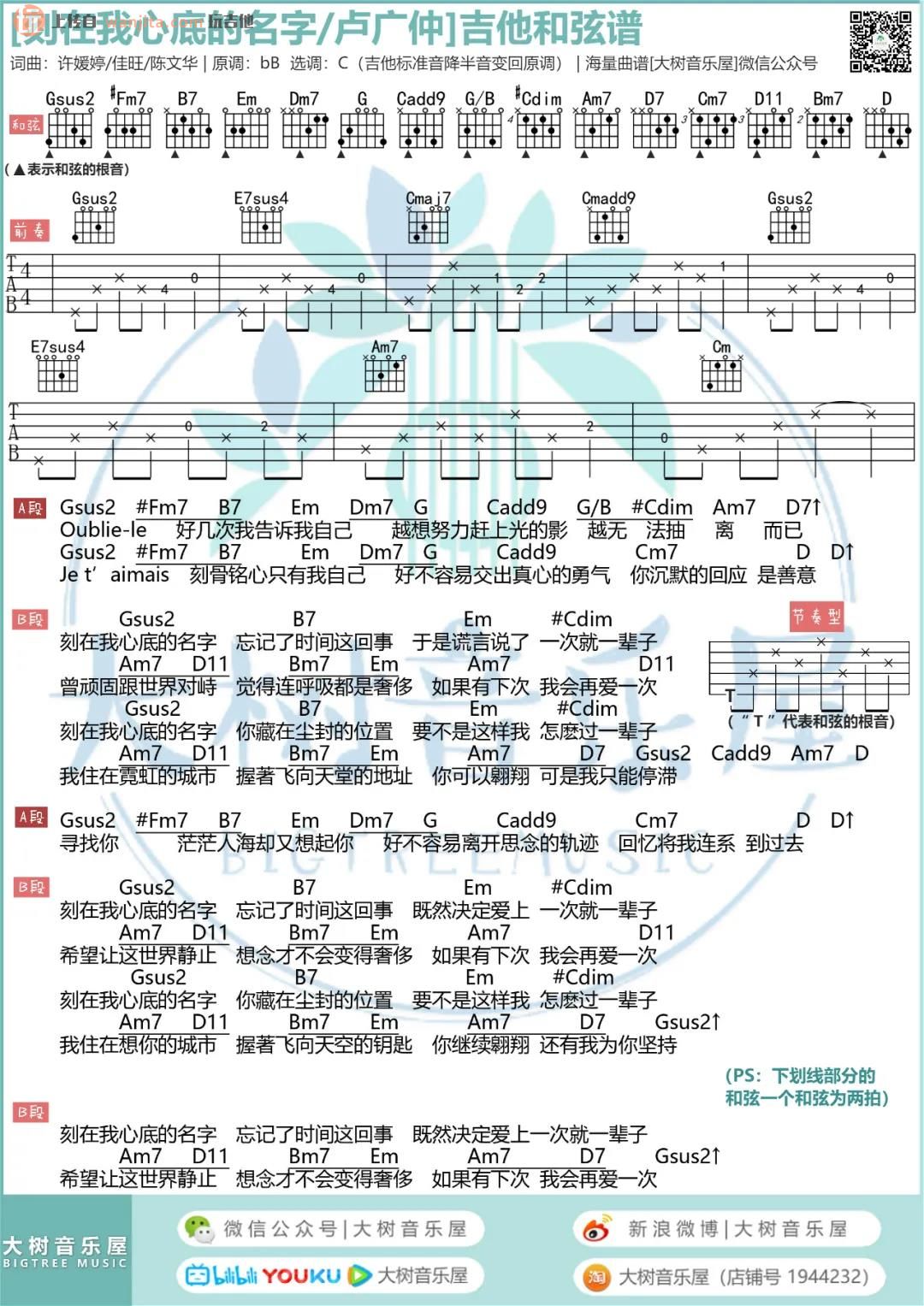 曲谱介绍: 《刻在我心底的名字》吉他谱,选用C调指法编配,弹唱难度不大,这首歌曲包含了完整的吉他弹唱视频示范,由女版演示,喜欢的朋友最好先参考视频,另外下方有和弦谱和六线谱,可以先练习六线谱,然后熟悉后使用和弦谱。 《刻在我心底的名字》吉他弹唱视频示范