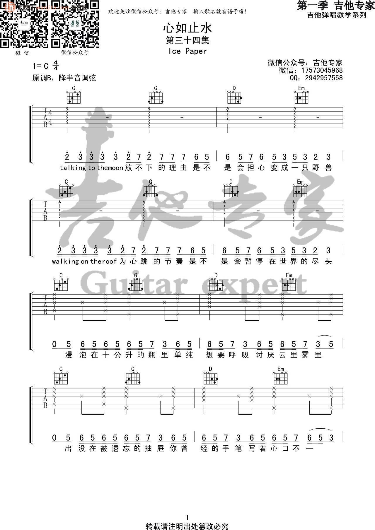 曲谱介绍: 《心如止水》吉他谱,原调是B调,选用C调指法编配,降半音调弦,弹唱难度不大,也比较适合新手。