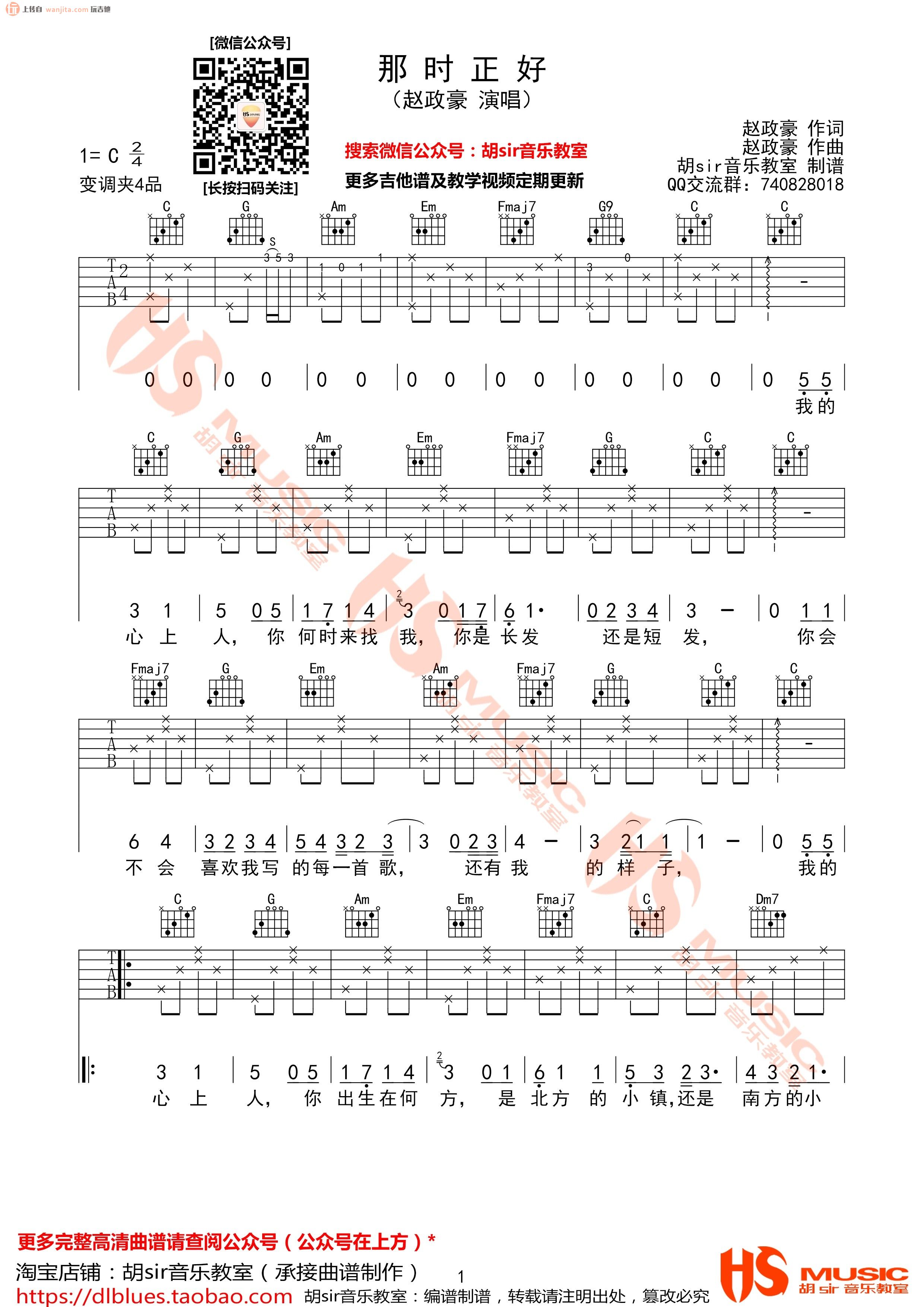 曲谱介绍: 《那时正好》吉他谱,由胡sir音乐教室制谱,选用C调指法,弹唱难度,变调夹夹4品可以弹唱原调,这个版本包含了前奏,喜欢的朋友不要错过。