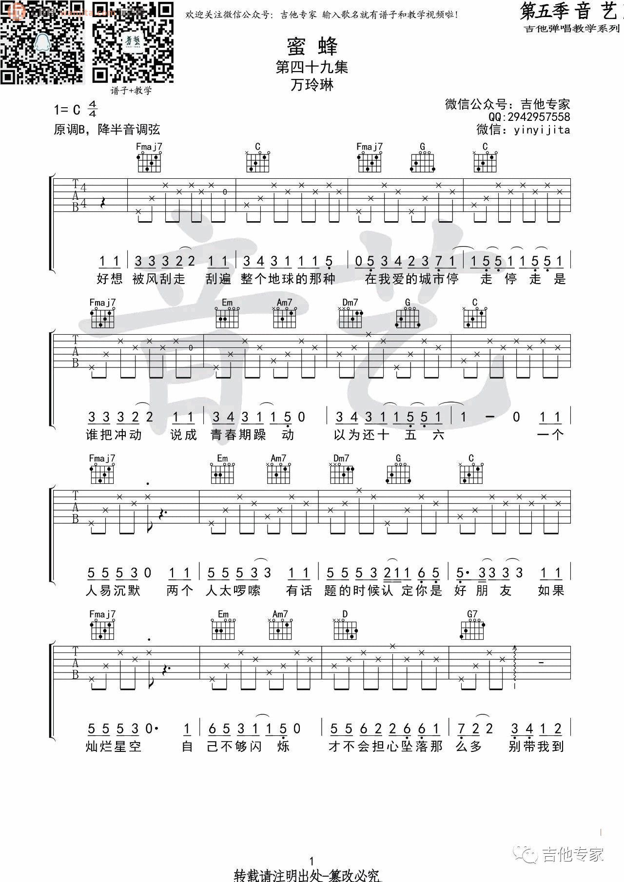 蜜蜂吉他谱 - 万玲琳 - C调吉他弹唱谱 - 原版