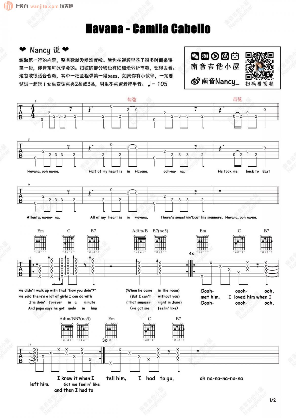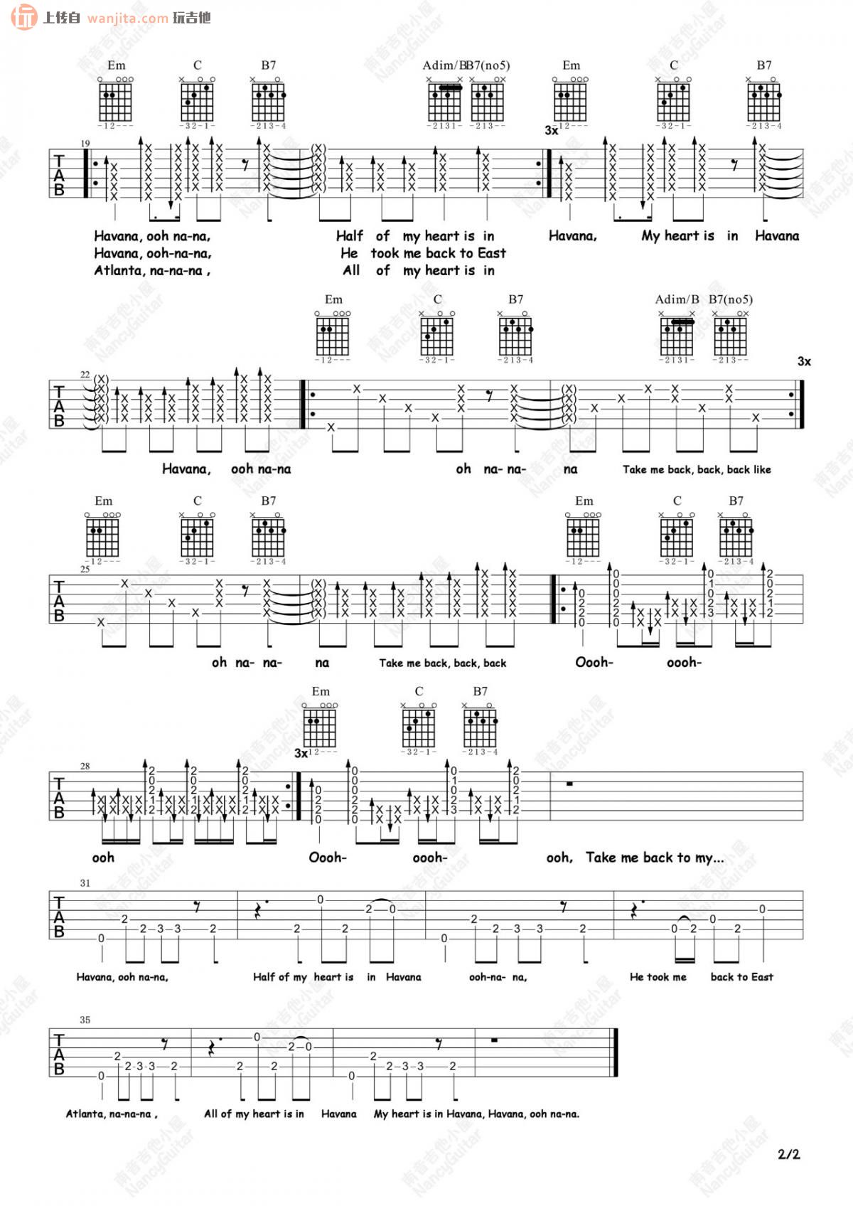 曲谱介绍: Camila《Havana》吉他弹唱谱,采用C调指法编配原版,共有2张高清图谱,免翻页排版设计。