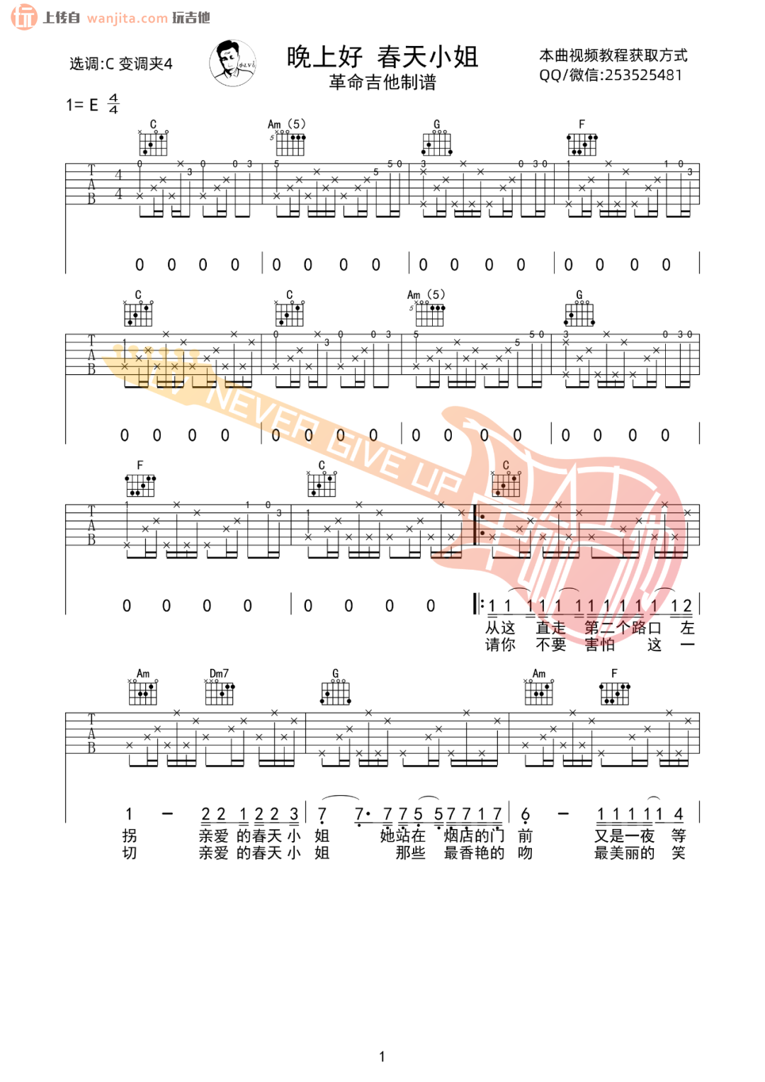 曲谱介绍: 《晚上好春天小姐》吉他弹唱视频示范 《晚上好春天小姐》吉他谱,选用C调指法编配,原调是E调,这首歌曲包含了完整的前奏,弹唱难度适中,新手上手难度不大。