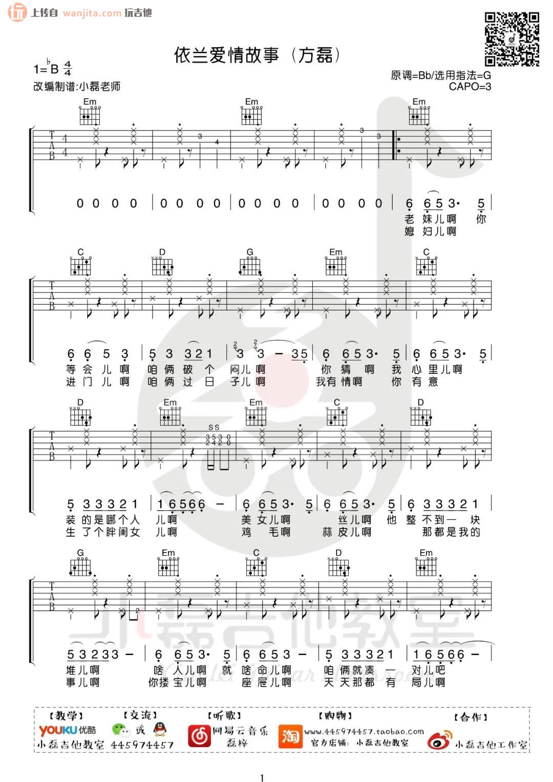 曲谱介绍: 《依兰爱情故事》吉他弹唱视频教学 《依兰爱情故事》吉他谱,原调是bB,选用G调指法编配,变调夹夹在3品可以弹唱原调,整个曲谱弹唱的难点会是在节奏上,制音会是这首歌非常特色的部分,建议大家可以先行参照这首歌的吉他弹唱视频演示,会更容易上手掌握。