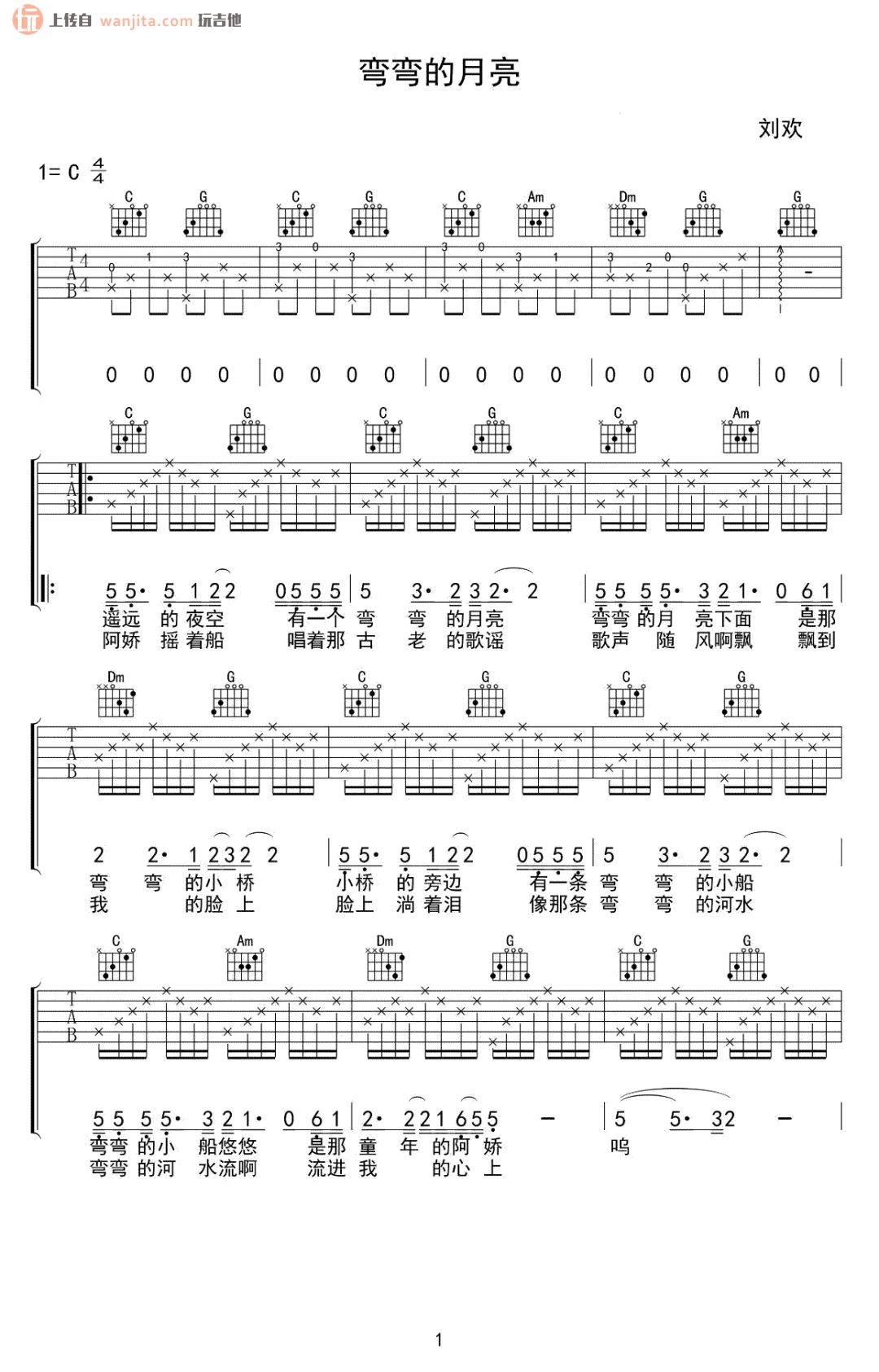 弯弯的月亮吉他谱 - 吉他弹唱教学 - C调吉他弹唱谱 - 原版