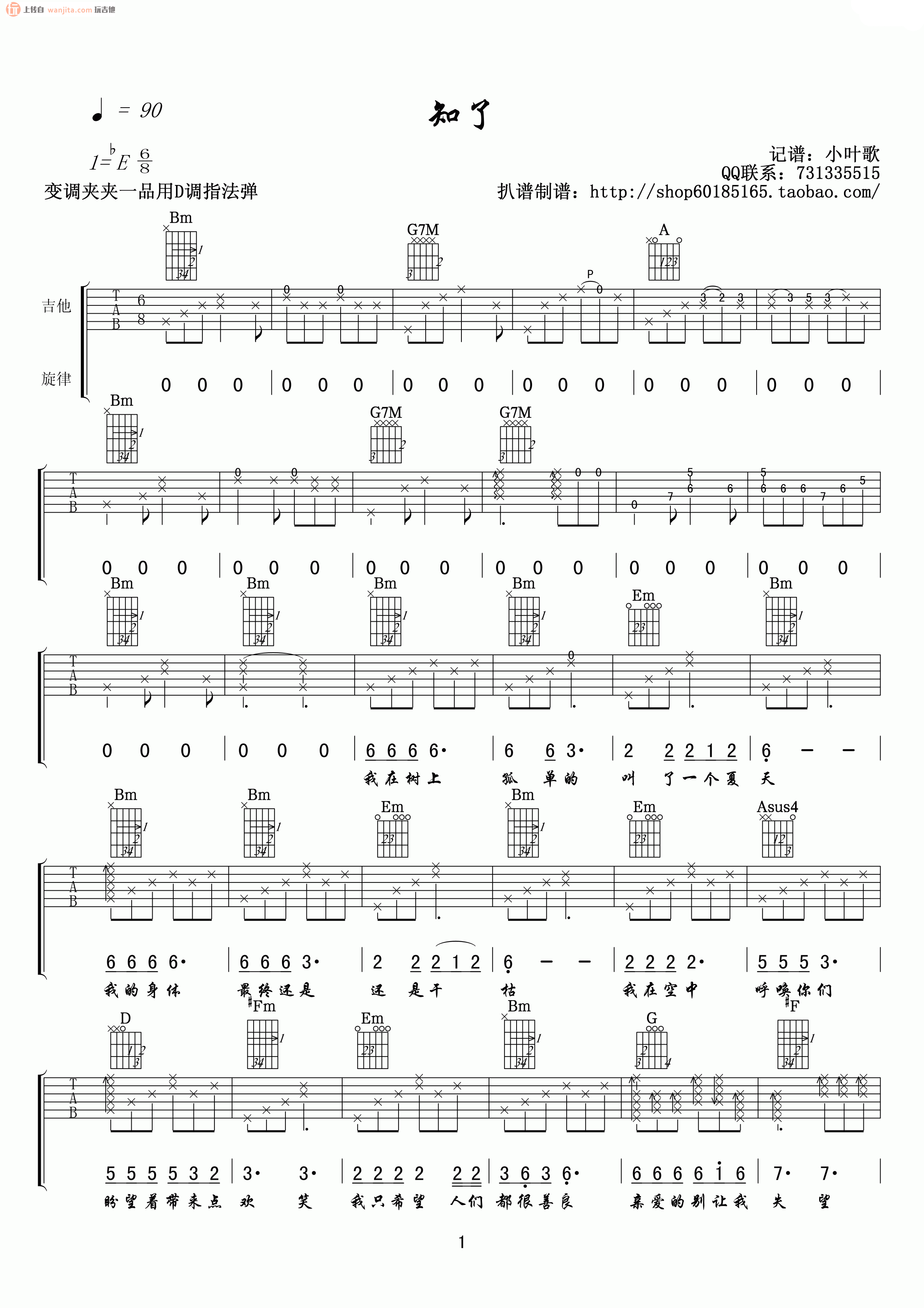 曲谱介绍: 《知了》吉他谱,原调是bE,选用D调指法编配,变调夹夹1品弹唱,总共2张高清图片谱,弹唱难度适中,需要花点心思练习。