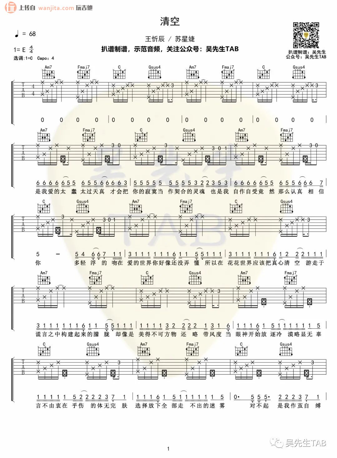 曲谱介绍: 《清空》吉他谱,原调是E调,选用C调指法编配,变调夹夹4品可以弹唱原调,这个版本的谱子包含拍弦的节奏处理,大家可以尝试练习一下这样的节奏方式。