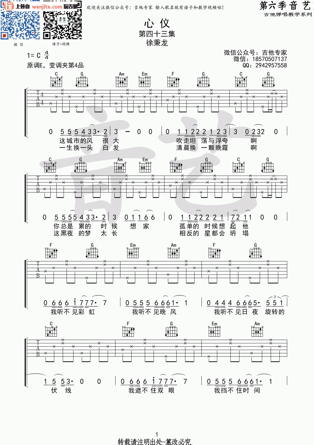 曲谱介绍: 《心仪》吉他谱,总共2张高清图片谱,原调是E调,选用C调指法弹唱,变调夹夹4品可以弹唱原调,曲谱简单易上手,对新手练习也十分友好。
