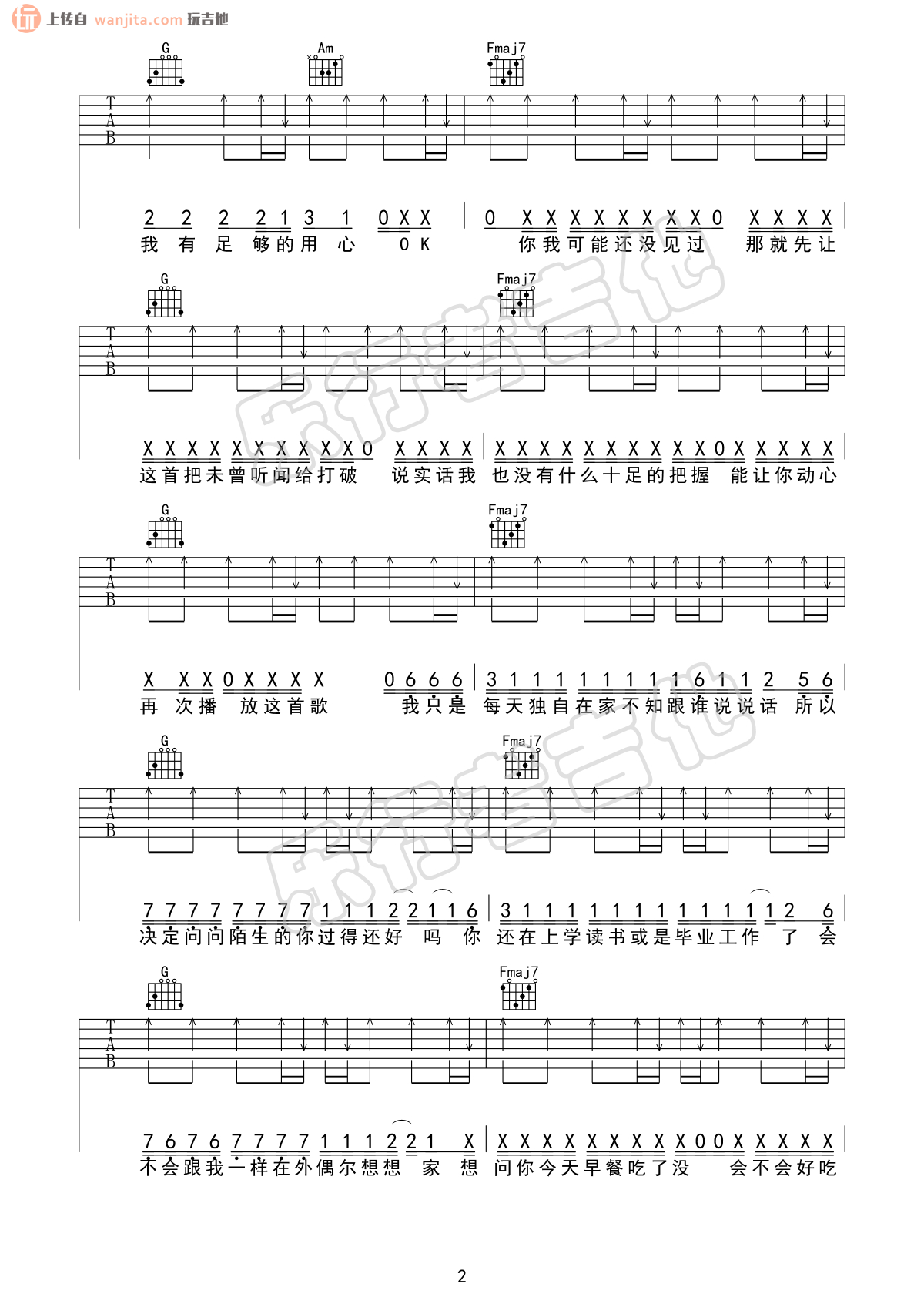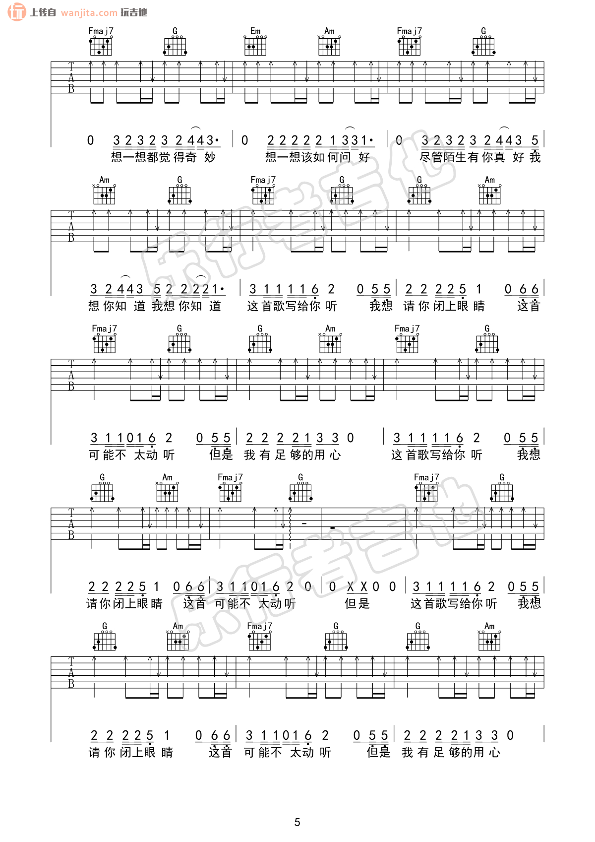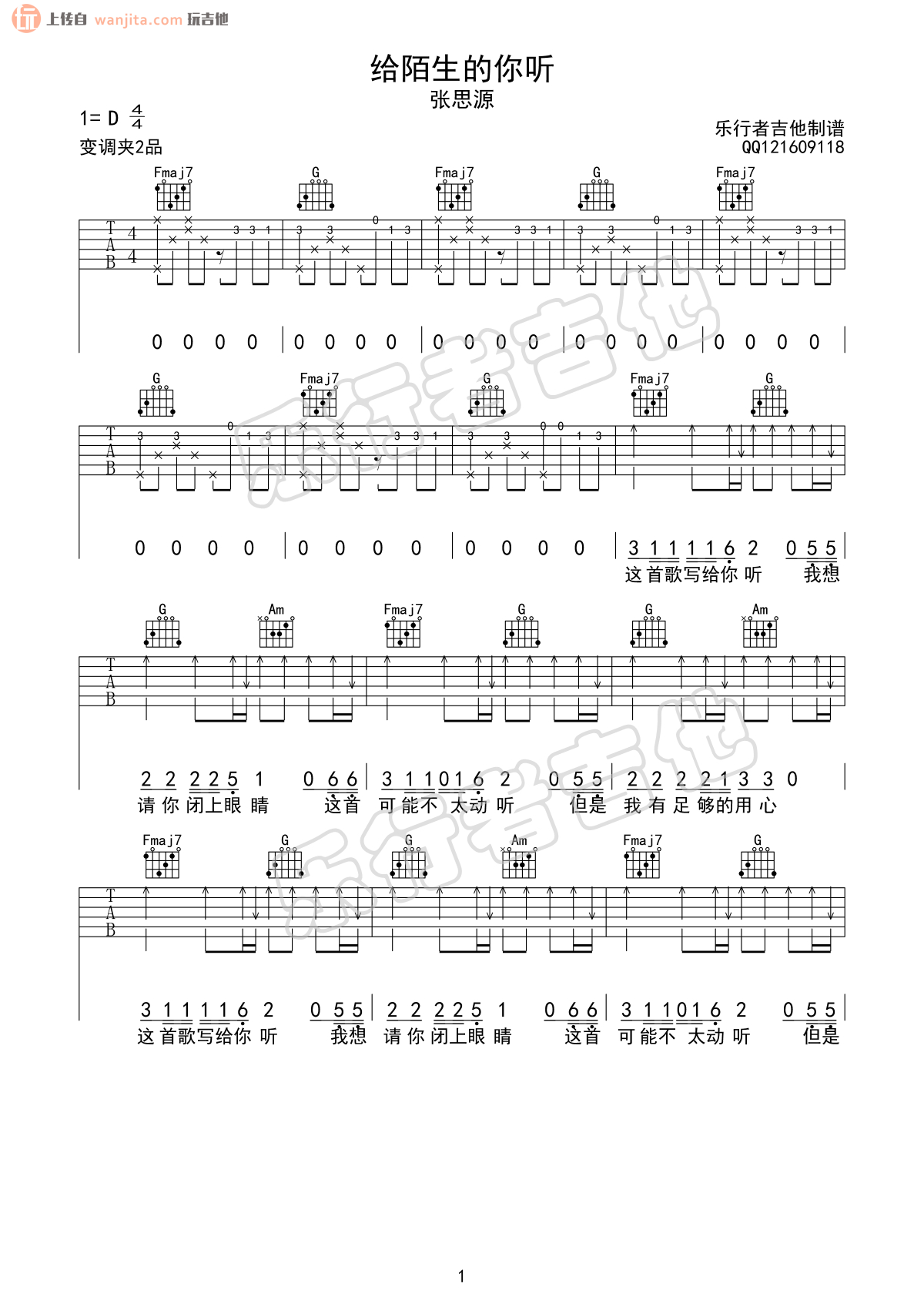 曲谱介绍: 《给陌生的你听》吉他谱,选用C调指法,原调是D调,变调夹2品就可以弹唱原调,歌曲还是很长,总共六张高清图片谱,扫弦节奏为主要的节奏型,弹唱难度并不大。