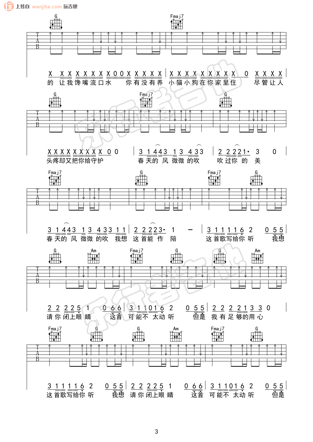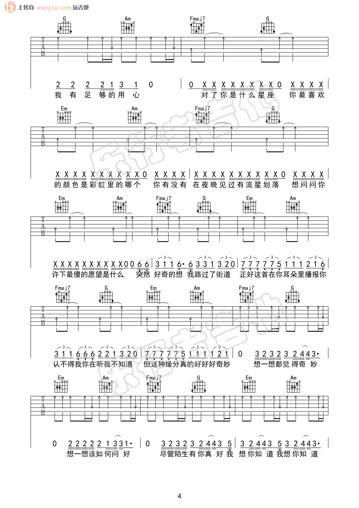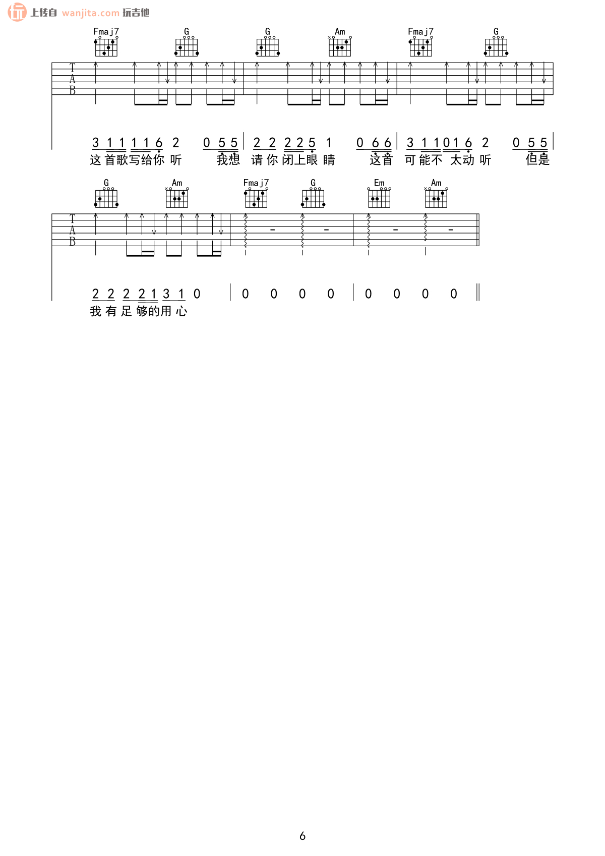 曲谱介绍: 《给陌生的你听》吉他谱,选用C调指法,原调是D调,变调夹2品就可以弹唱原调,歌曲还是很长,总共六张高清图片谱,扫弦节奏为主要的节奏型,弹唱难度并不大。