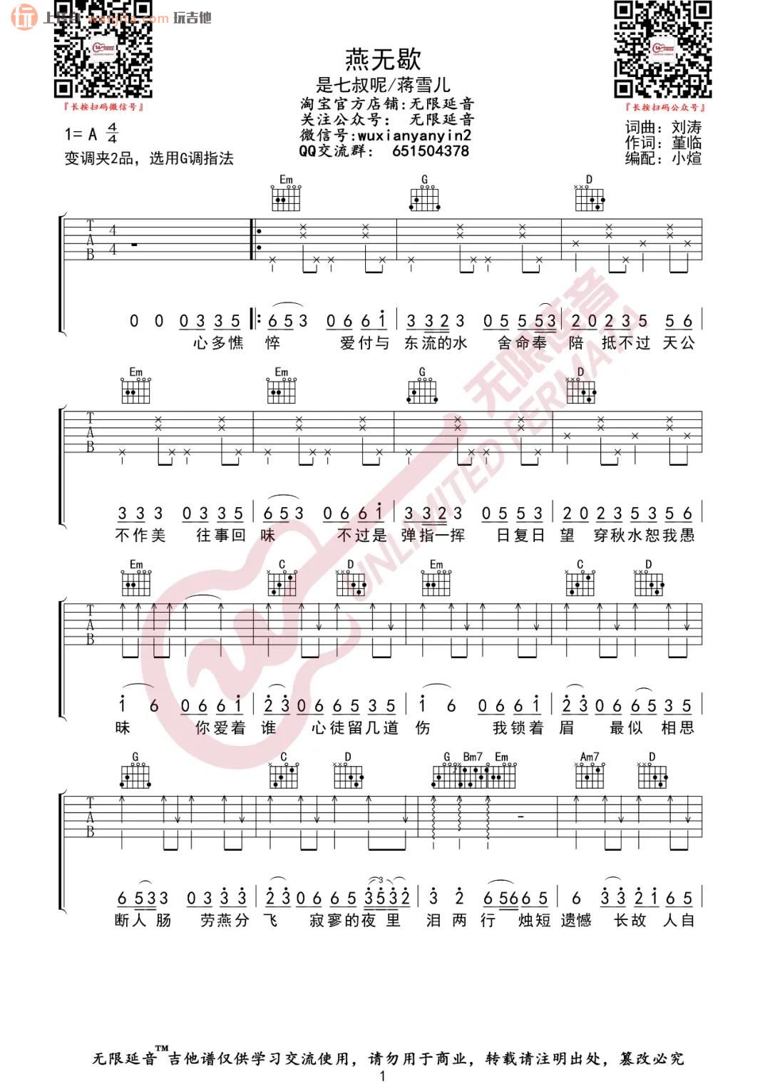 曲谱介绍: 《燕无歇》吉他谱由无限延音编配,原调是A调,选用G调,变调夹夹2品弹唱原调,整首谱子和之前的上传的其他版本基本上一样,不过从细节来说,会相对简单一点。同时推荐是七叔呢的一首,你也许会喜欢。