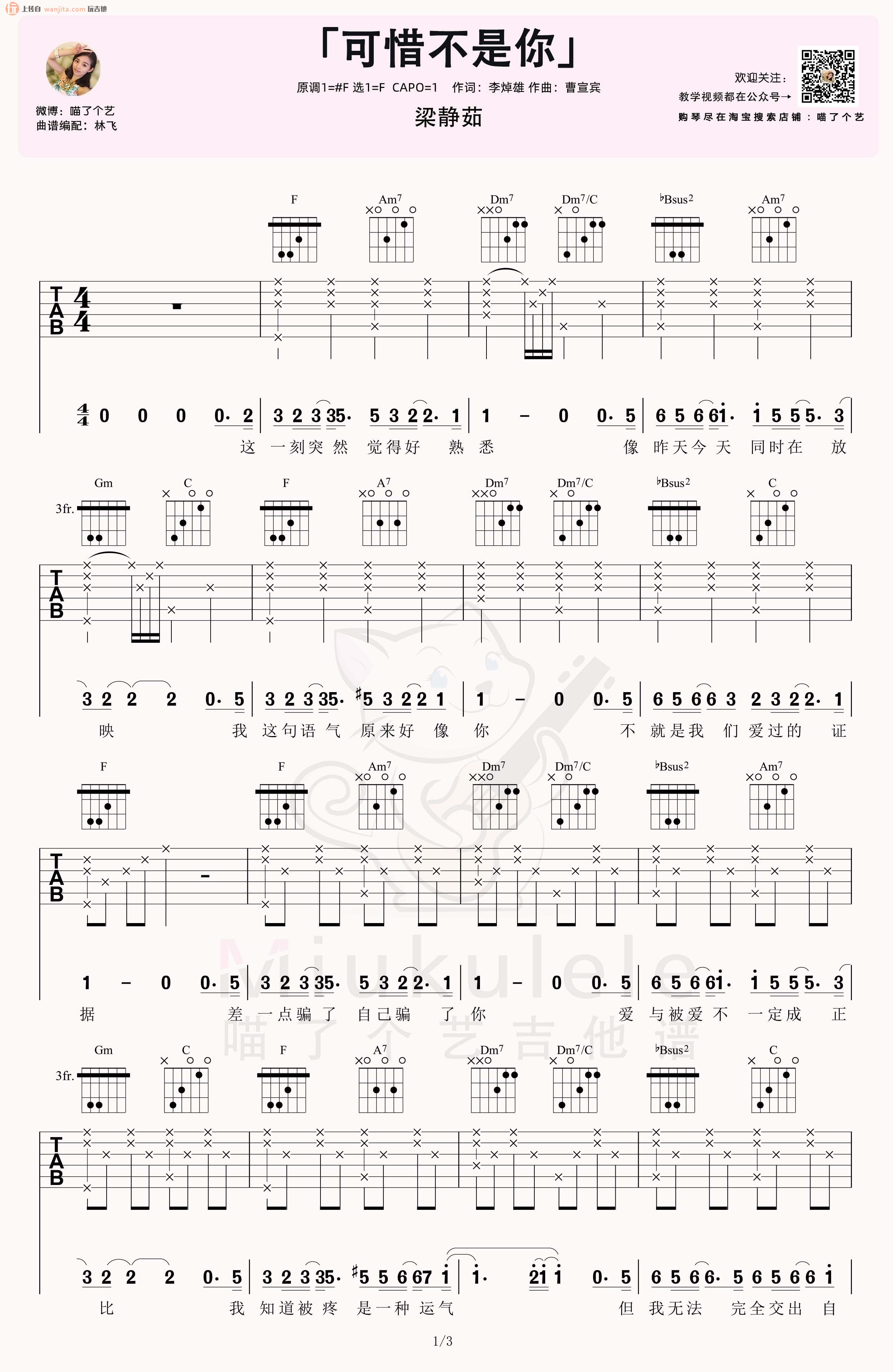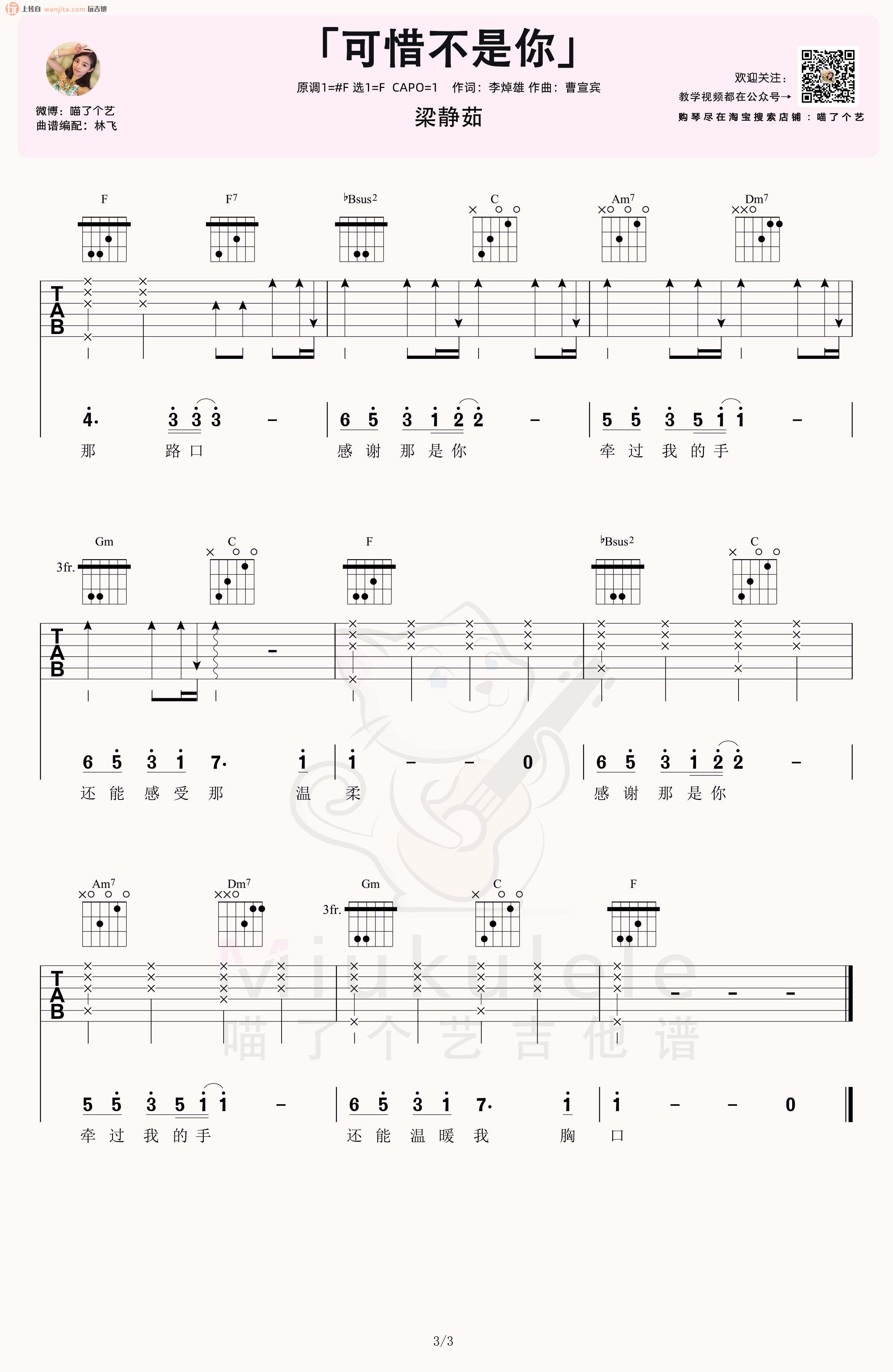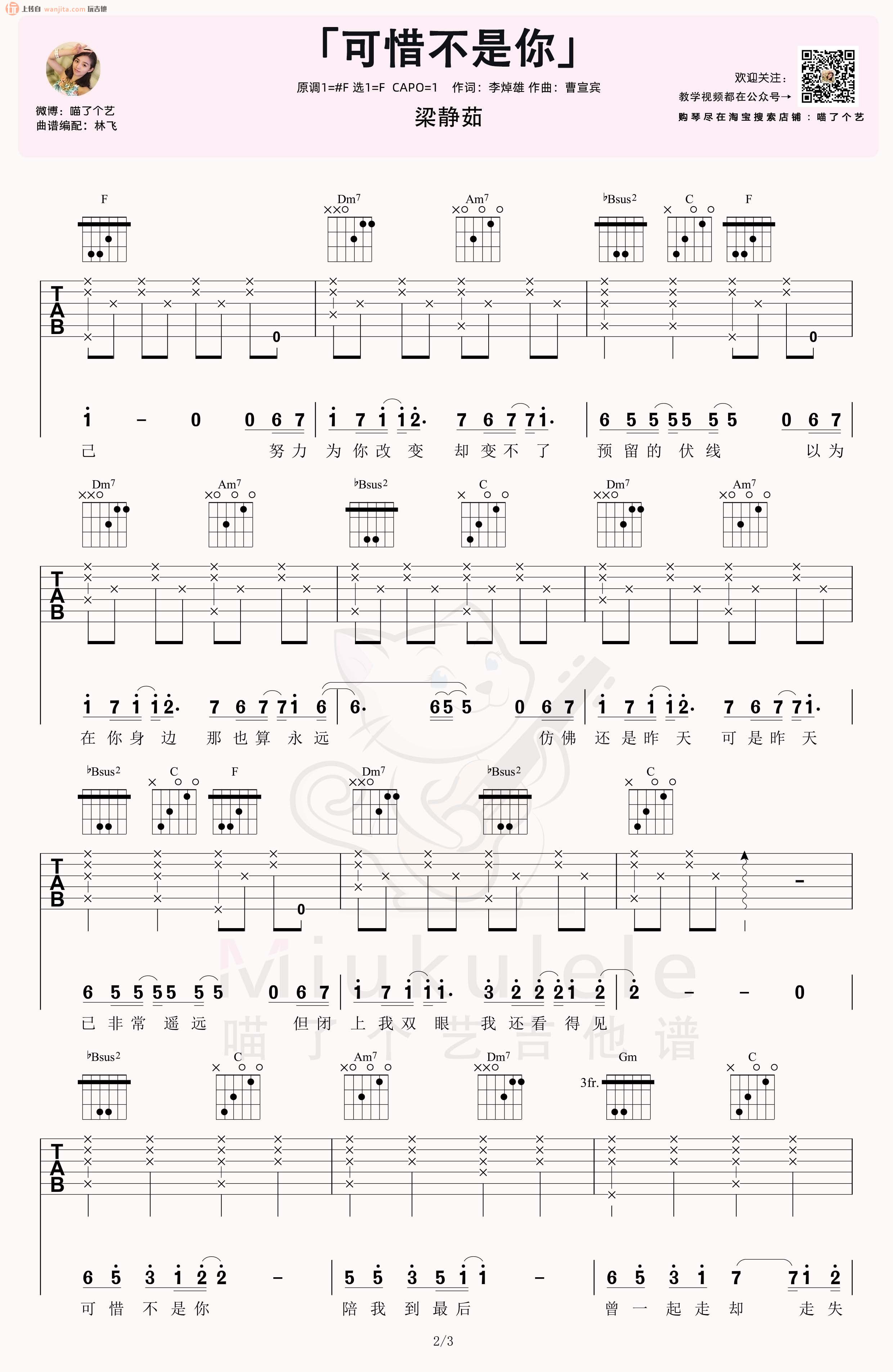 曲谱介绍: 《可惜不是你》吉他谱,由喵了个艺分享曲谱,选用F调,原调是#F,所以变调夹夹在1品弹唱原调,这首版本主要是女生版,男声音域较高的同学也可以弹唱F调尝试,感兴趣的朋友可以先看这首谱子的视频示范和教学部分,会便于更好的上手练习。 《可惜不是你》吉他弹唱视频示范 《可惜不是你》吉他弹唱教学