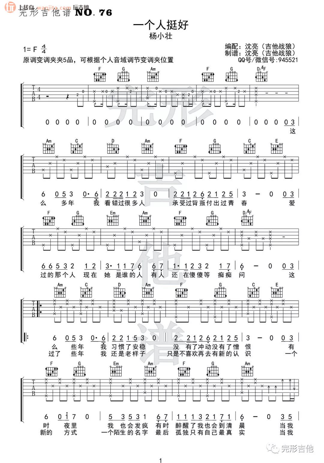曲谱介绍: 《一个人挺好》由完形吉他制谱,选用C调指法,原调是F调,变调夹夹5品可以弹唱原调,这首歌曲的原曲是77拍,可自行根据实际情况调整速度。 《一个人挺好》吉他弹唱教学视频
