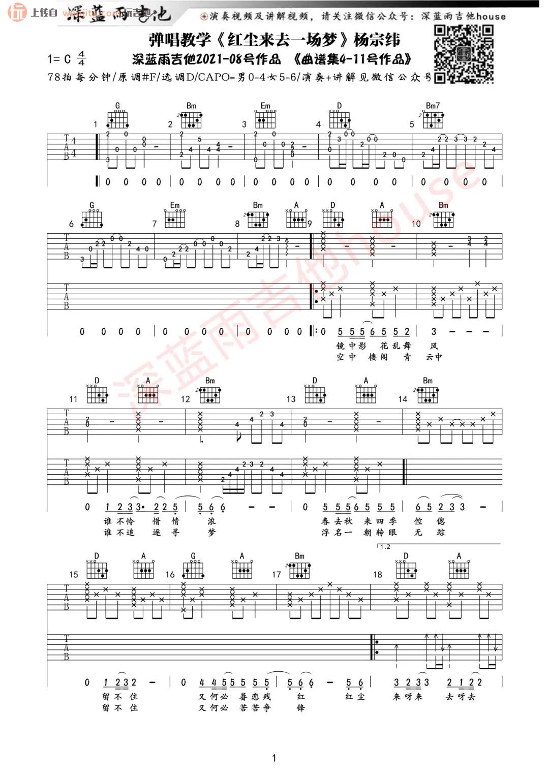 曲谱介绍: 《红尘来去一场梦》由深蓝雨编配制谱,选用D调指法,原调#F,弹唱难度适中,节奏中快慢变化有致,建议大家参考一下深蓝雨老师的弹唱视频教学,跟着练习。 《红尘来去一场梦》吉他弹唱教学/示范视频