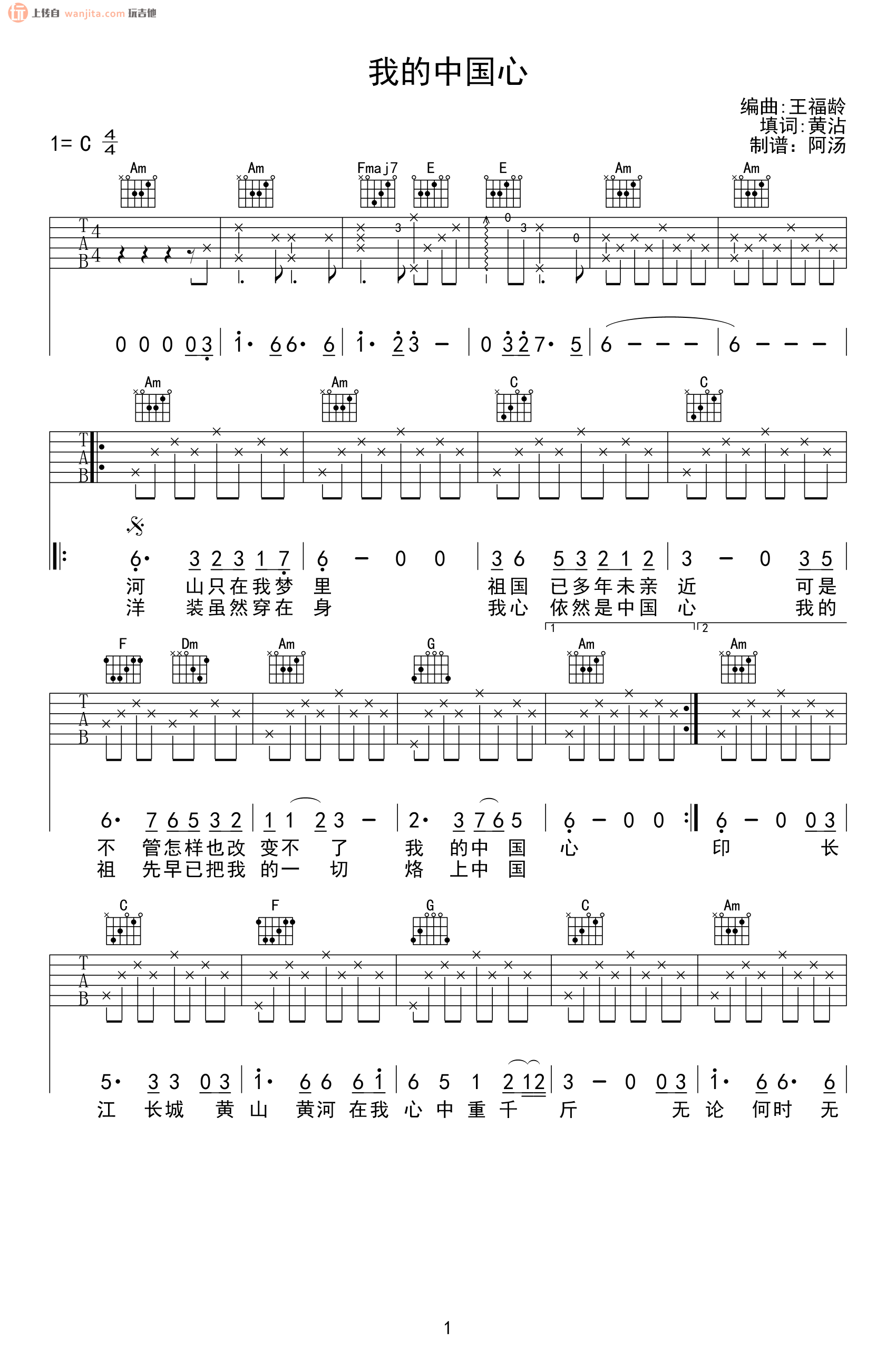 曲谱介绍: 《我的中国心》吉他谱,选用C调指法编配,包含完整的前奏部分,整体弹奏难度不大,新手也可以很好的练习这个版本。