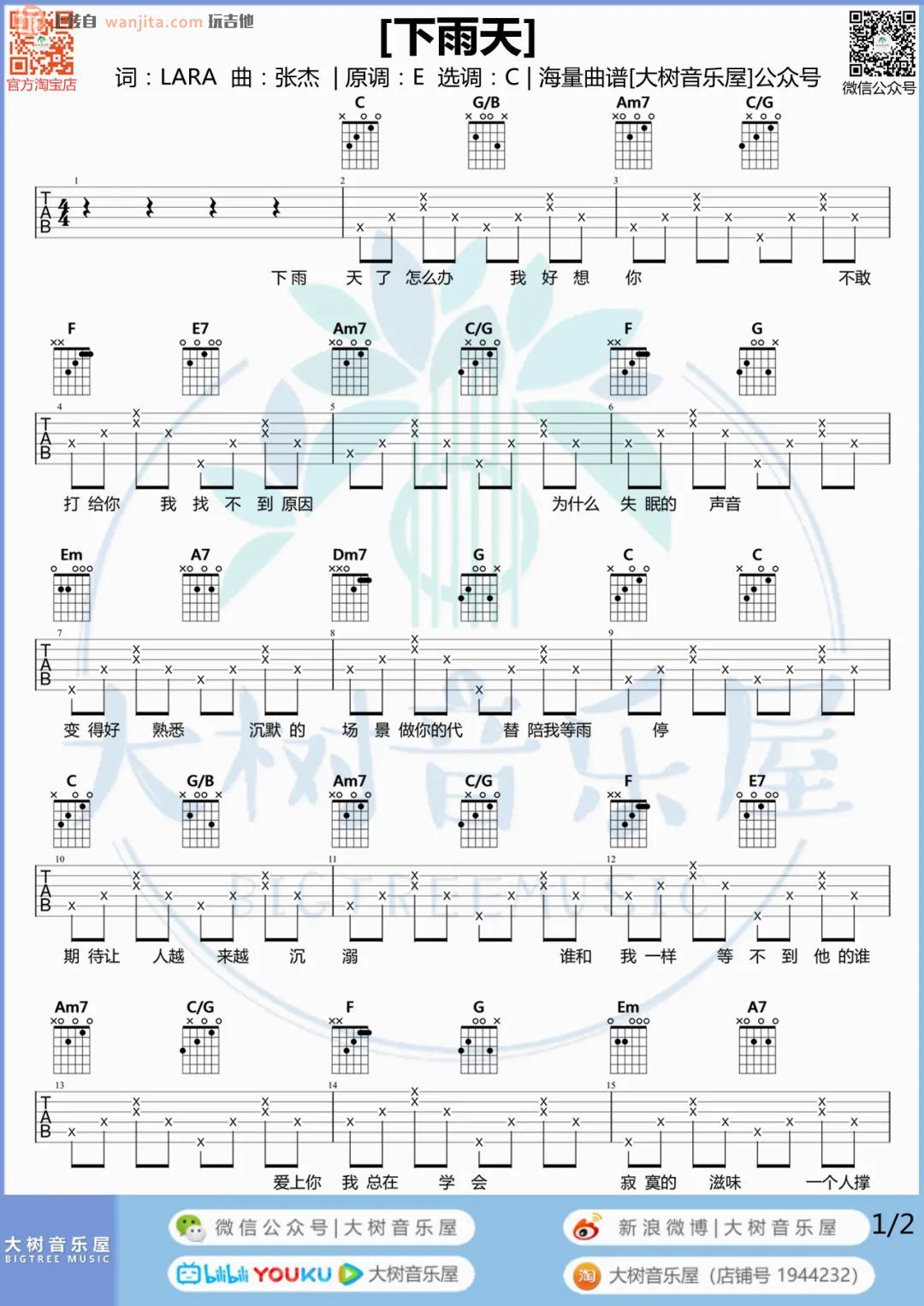 曲谱介绍: 《下雨天》吉他谱,由大树音乐吉他编配,原调是E调,选用C调指法编配,所以整体难度都不大,新手也可以容易上手。另外变调夹可以夹1品弹唱(参考视频),这首谱子同时提供了完整的弹唱教学和示范2个视频,大家参考后会更加掌握弹奏感觉。 《下雨天》吉他弹唱示范 《下雨天》吉他弹唱教学视频