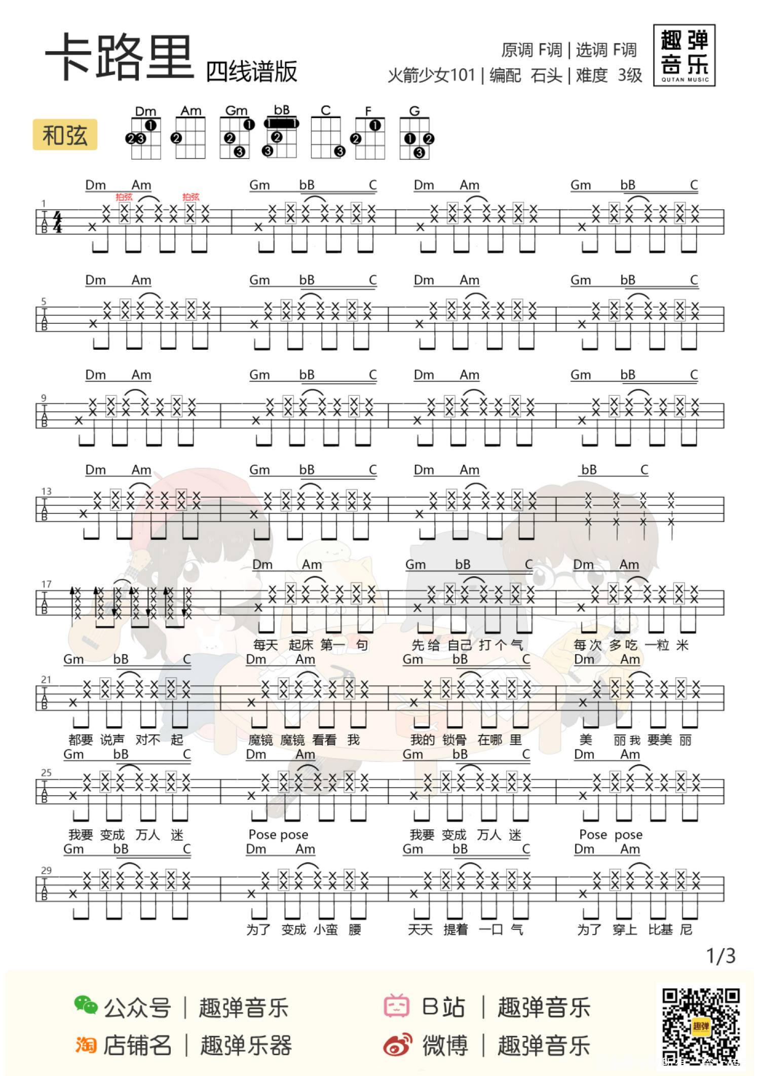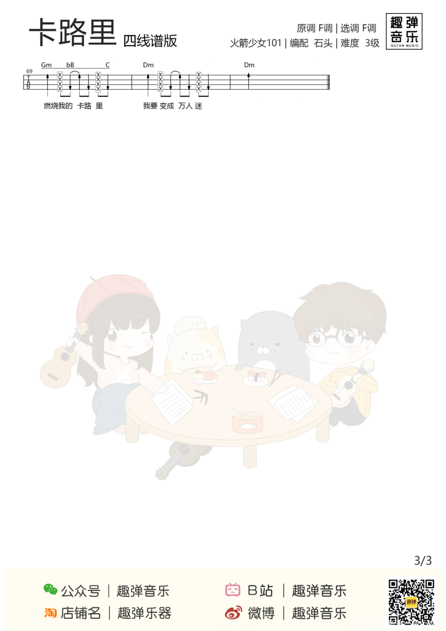 曲谱介绍: 自从火箭少女101出道 就一直站在舆论的风口 大家的吐槽就没停下过 前一阵子的退团风波 更是在网上引爆了热议   《卡路里》无疑成为最大赢家 在音乐平台的播放量不断飙升 可能第一次听会觉得 就是一首无聊的土嗨歌 多听几次:太魔性我已被洗脑! 尤其是杨超越的那句“破音” “燃烧我的卡路里!” 如果哪家健身房不放这歌 那才真的是OUT了 弹琴唱歌也可以燃烧卡路里噢~ 今天石头和秋天老师一起合作 为大家带来了这首卡路里 一起跟着节奏抖动起来吧   原曲介绍 这首歌作为电影《西虹市首富》的插曲,歌词比较无厘头也很贴近地气,加上魔性的旋律和电音效果,被网友们戏称是一首洗脑的土嗨歌曲。 整首歌的MV讲述的是女孩们为了减肥瘦身而所做的种种努力的故事,和《西虹市首富》电影里面的一个小片段不谋而合,在看电影时听到这首歌还是挺带感的。   尤克里里弹唱曲谱