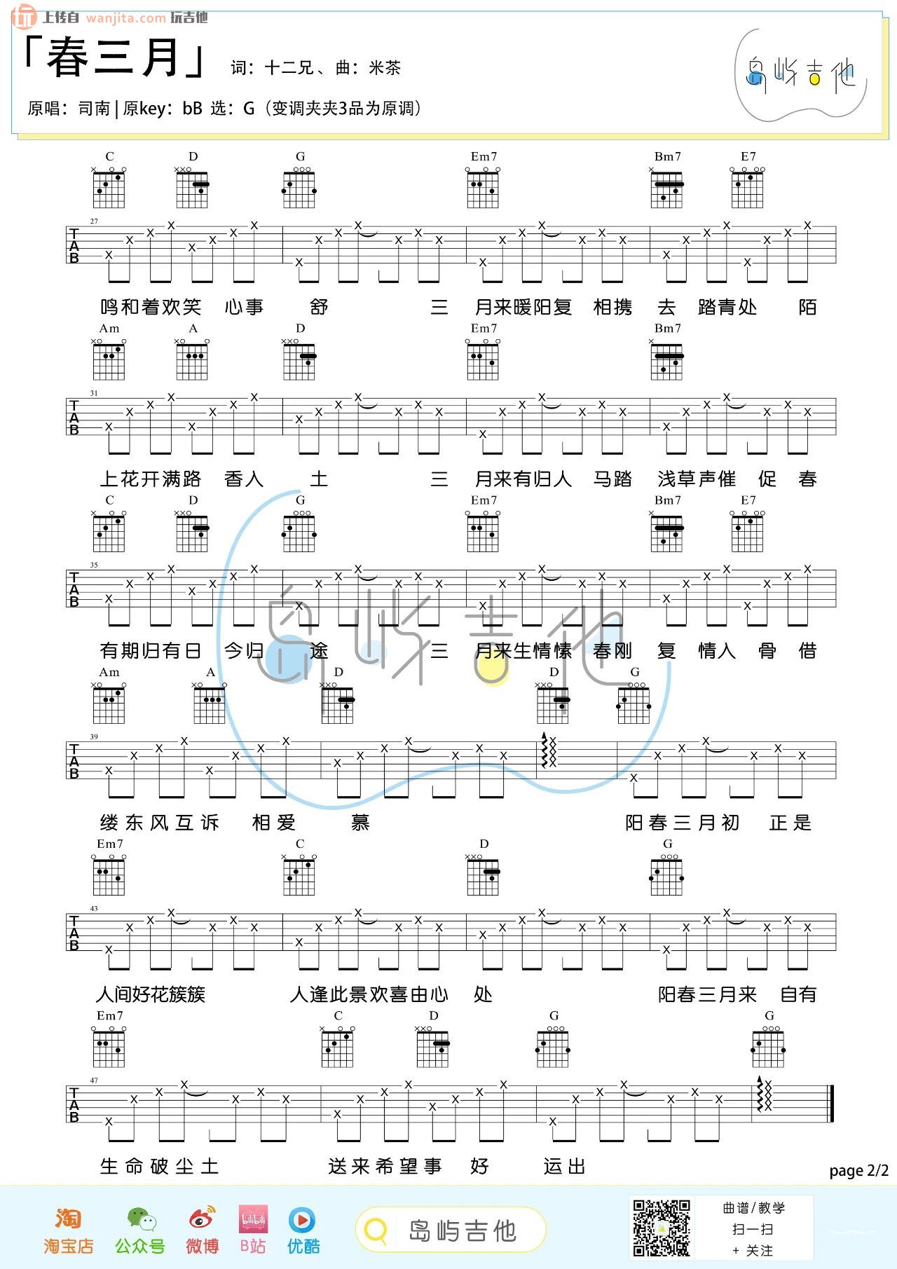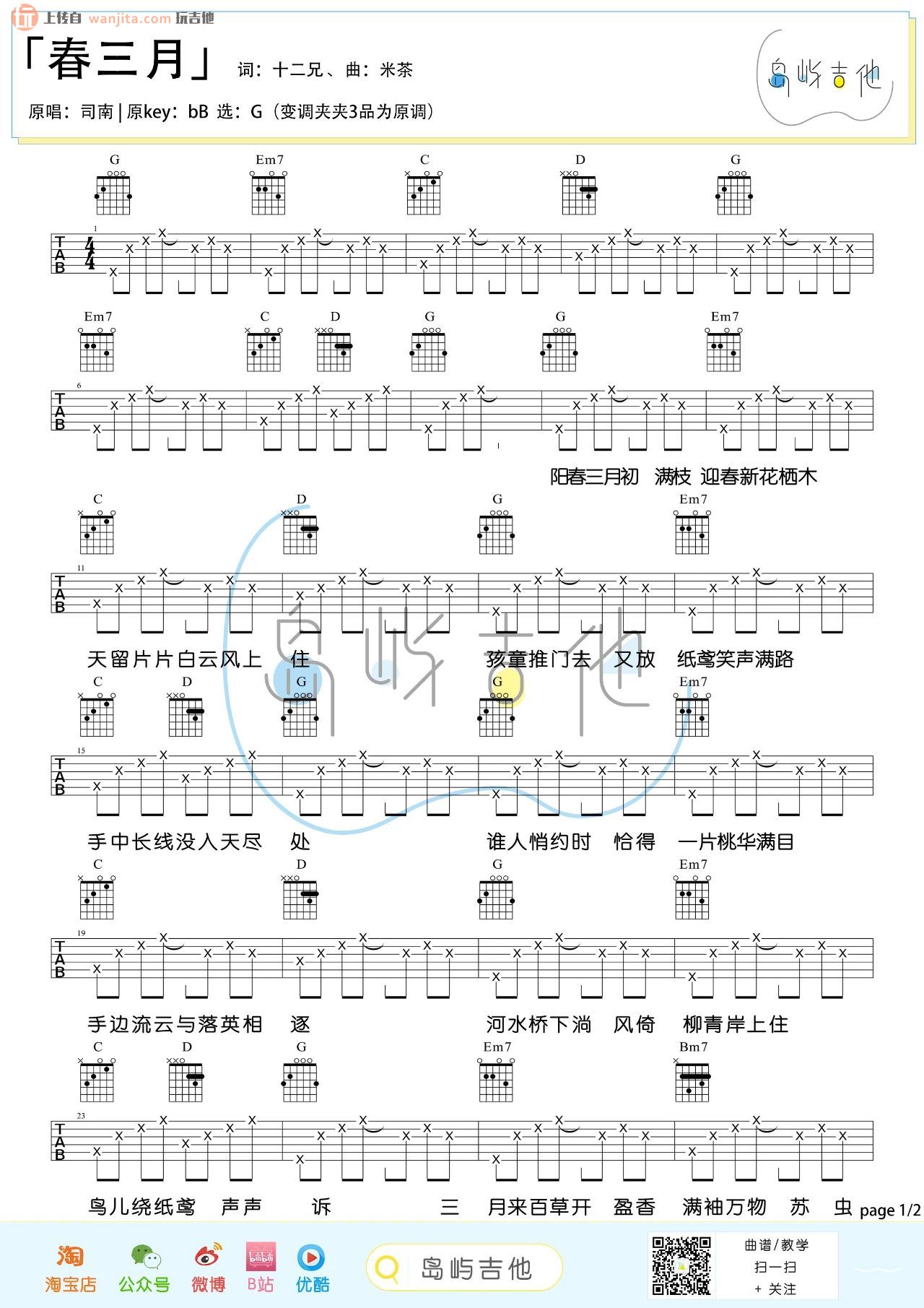 曲谱介绍: 《春三月》吉他谱,由岛屿吉他编配制谱,选用G调指法,原调是bB,弹唱很简单,同时也非常适合新手的弹唱练习。