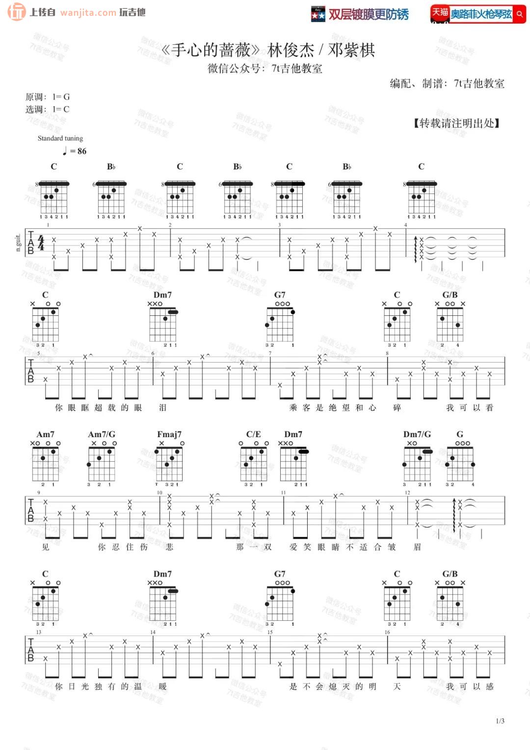 曲谱介绍: 《手心的蔷薇》吉他谱,感谢7T吉他教室制谱分享,选用C调指法,这个版本非常的舒服,和原版非常接近,下方有这首歌曲的视频弹唱教学部分,这首歌的原调是G大调,视频演示是用的是C大调的指法来编配,有降半音调弦。这个C调版本的谱子不适合弹原调,毕竟这样编配的调式变调夹夹太多品也不太好。 《手心的蔷薇》吉他弹唱教学视频 先从基本说一下,把一些三和弦丰富一下,二级、三级、六级大部分用了小七;四级用了maj7;五级用了属七;结尾的一级用了sus4…… 主歌部分,以主和弦C开始后,直接用了251进行,并且在回到一级之后,紧接着串联 1 → 5/7 → 6m → 6m/5 → 4 → 1/3 → 2m →5 这样一个经典的卡农走向,这里面有几个斜杠和弦的运用,使得低音部分有一个顺畅的下行,这种方法很常用 副歌部分,就是两遍的4536251,并且在两遍之间用了 Gm7 → C7 → Fmaj7 这个251离调的方法。 PS:这些内容是让大家更懂乐理哦!