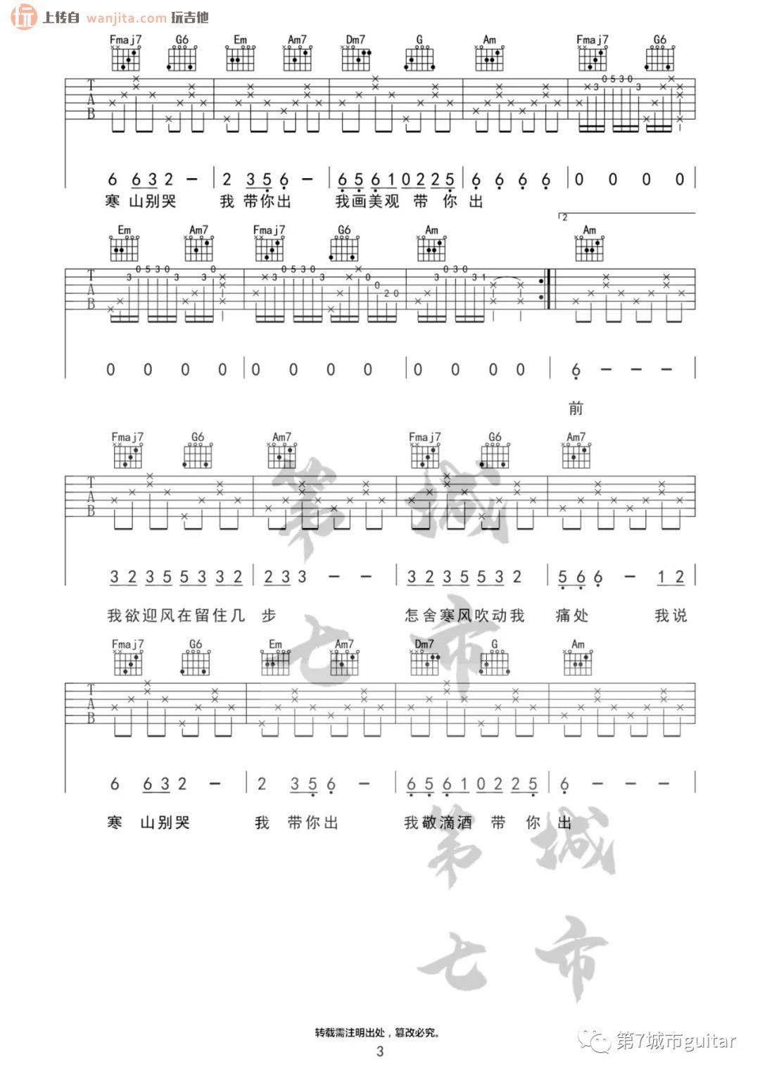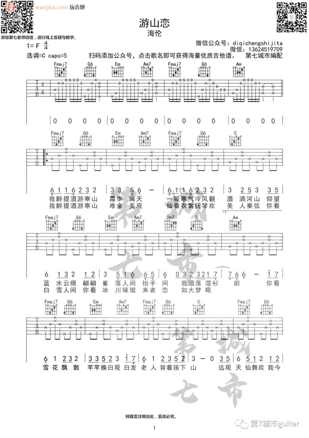 曲谱介绍: 《游山恋》吉他谱,由第七城市编配制谱,原调是F调,选用C调指法,所以变调夹夹得会比较高,可以在5品弹唱原调,包含前奏部分,整体弹唱难度不大,主要是前奏和间奏的掌握。