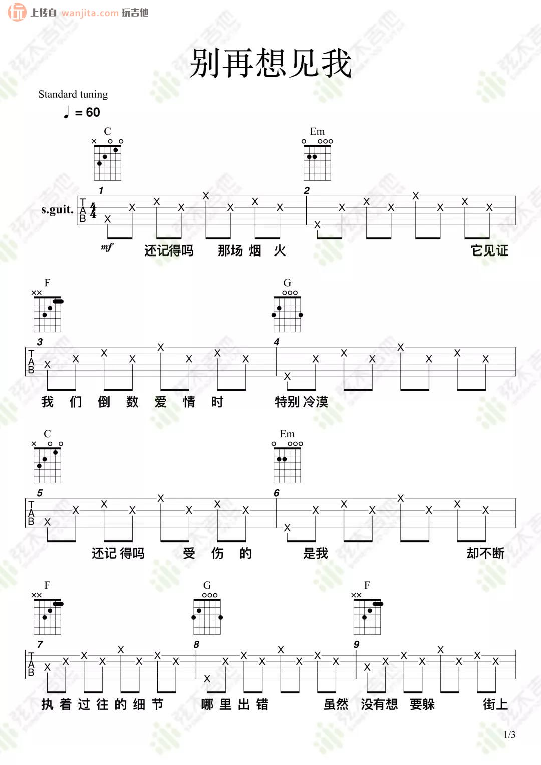 曲谱介绍: 《别再想见我》吉他谱,由弦木音乐编谱,曲谱十分简单,选用C调指法编配,弹唱难度不大,适合新手弹唱练习。