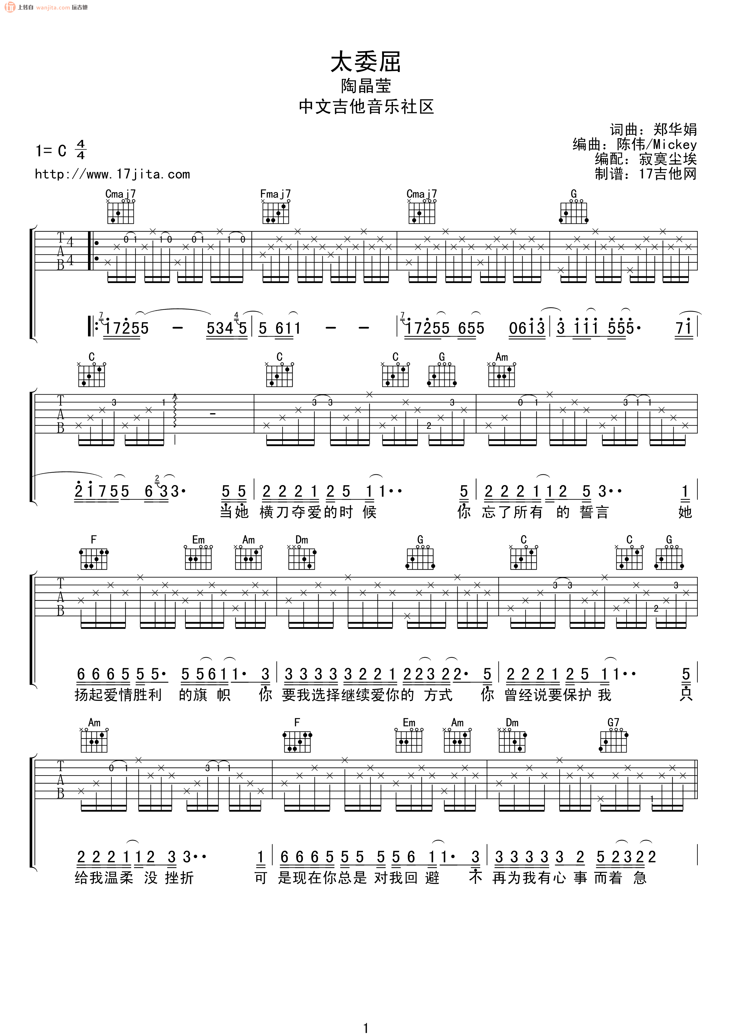 太委屈吉他谱 - 陶晶莹 - C调吉他弹唱谱 - 原版