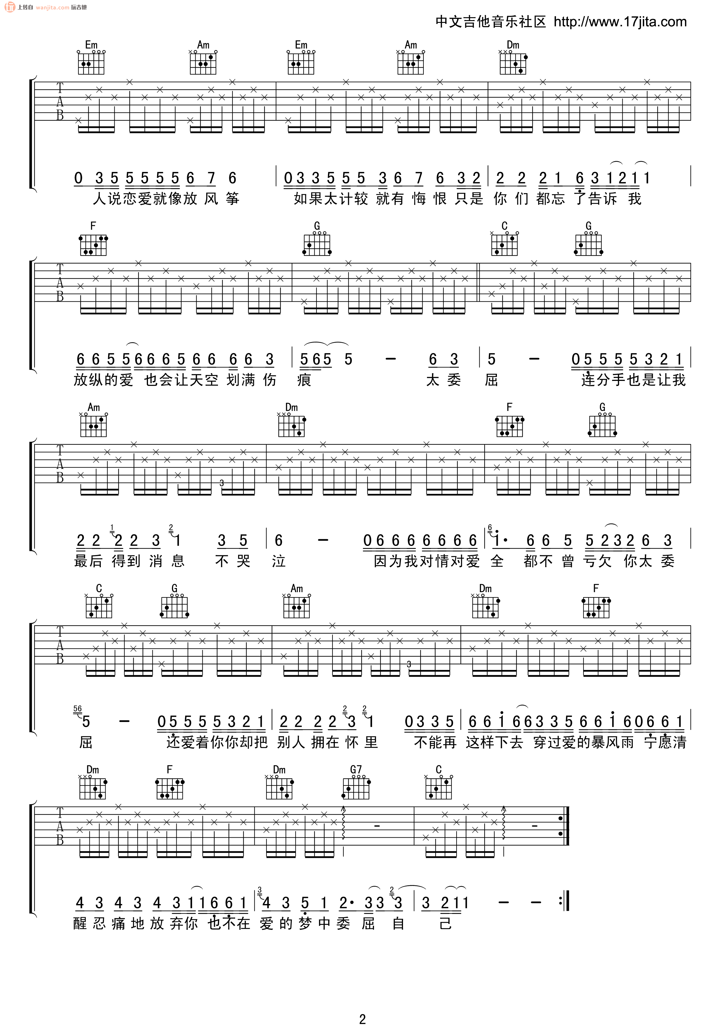 曲谱介绍: 《太委屈》吉他谱,选用C调指法编配,弹唱难度不大,简单的分解和弦即可弹唱,总共2张高清图片谱。