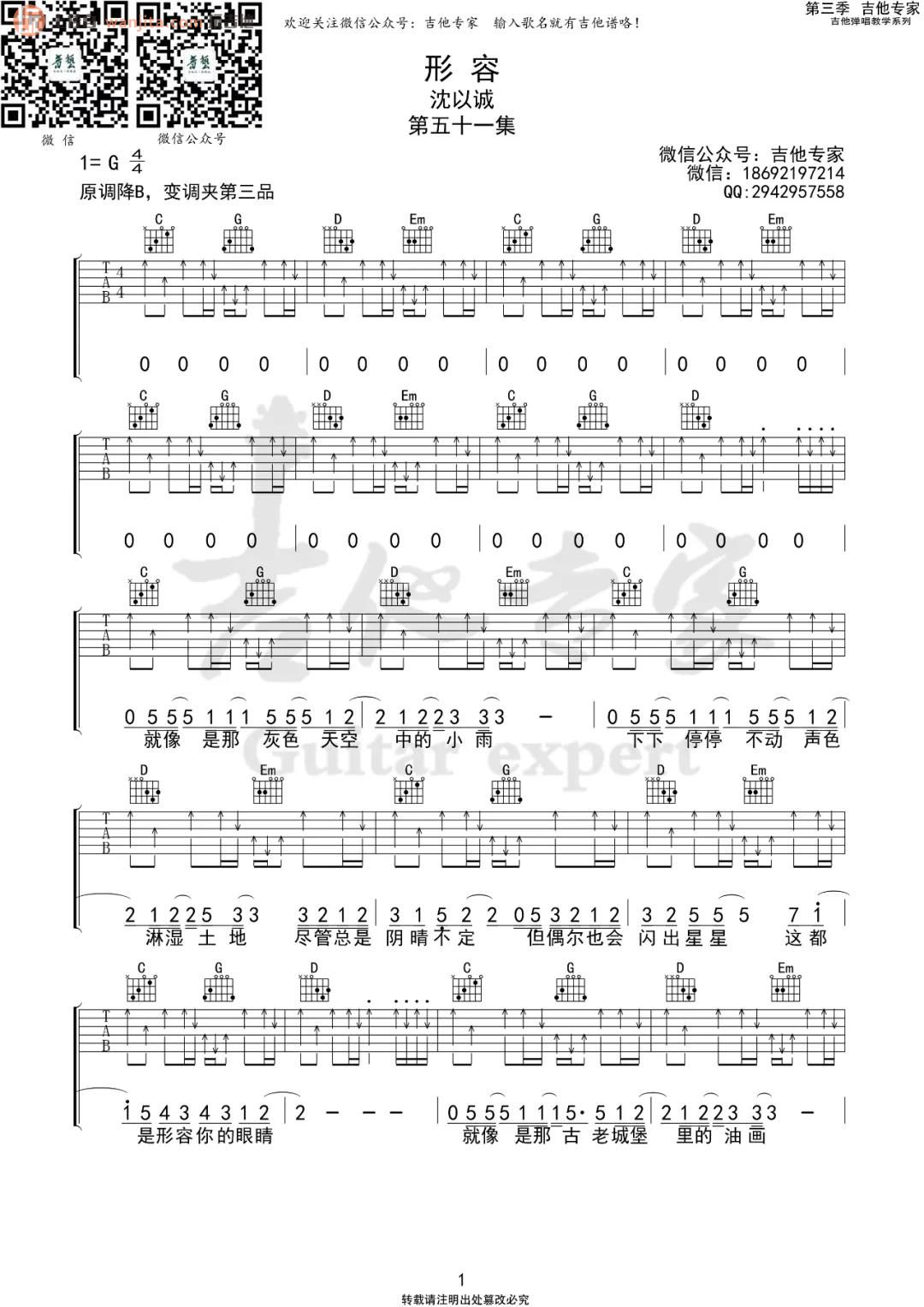 形容吉他谱 - 沈以诚 - G调吉他弹唱谱 - 原版