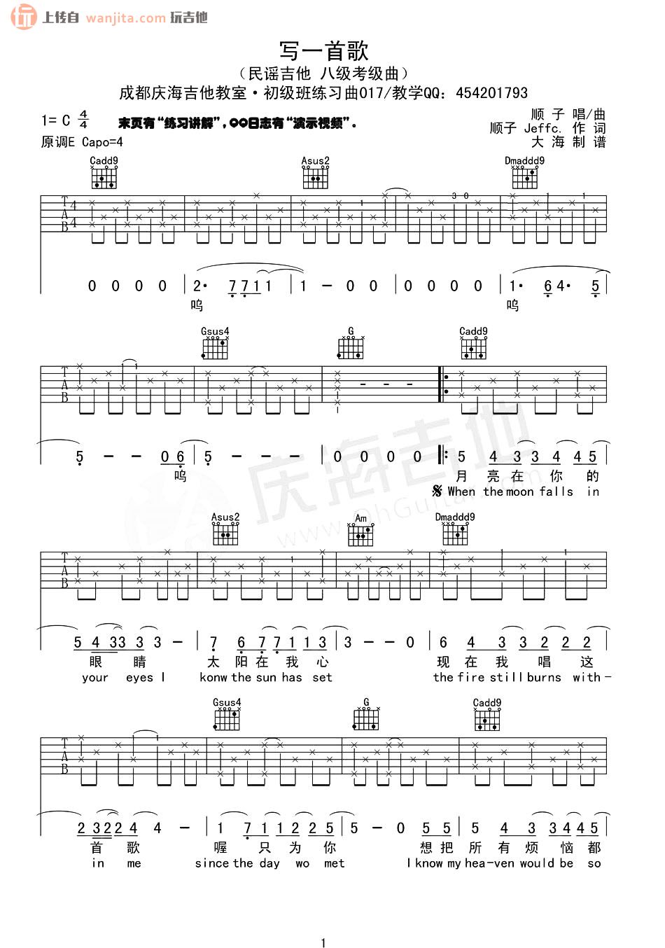 写一首歌吉他谱 - 顺子 - C调吉他弹唱谱 - 原版