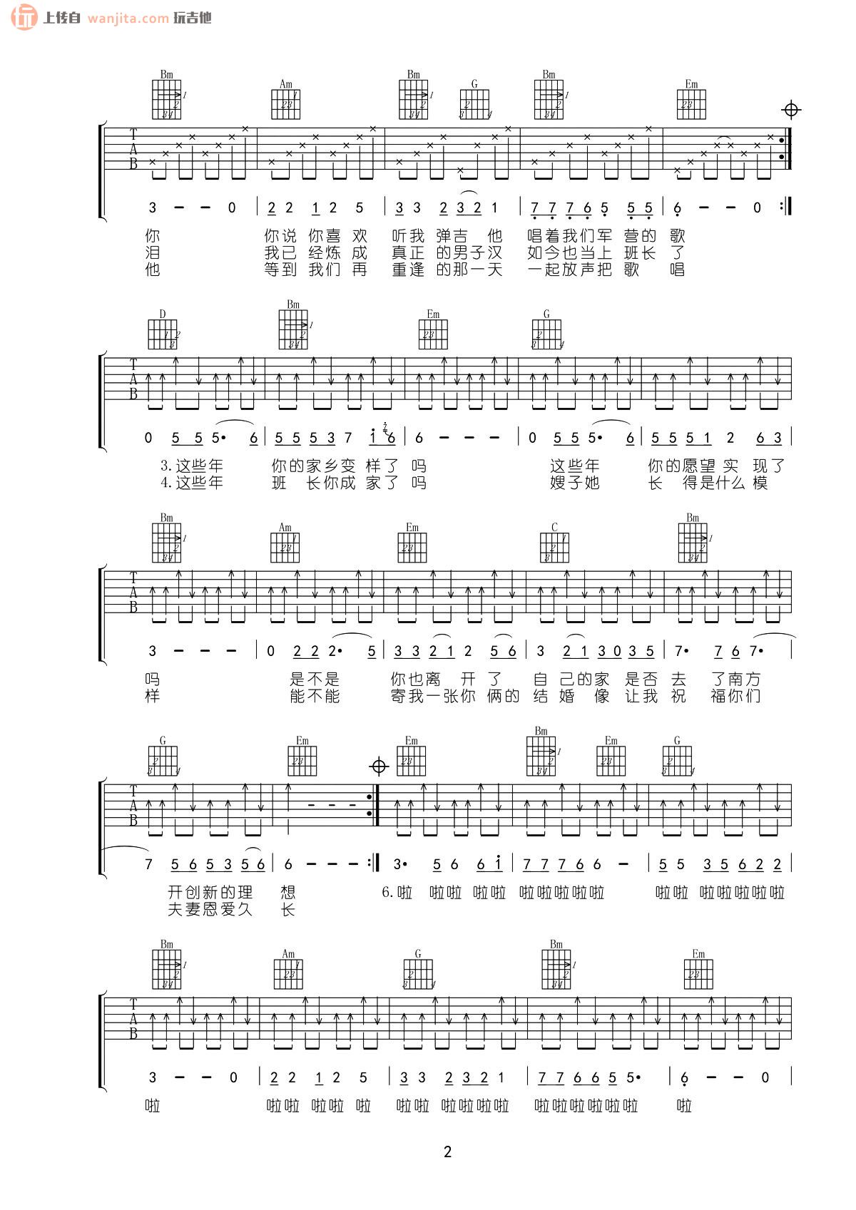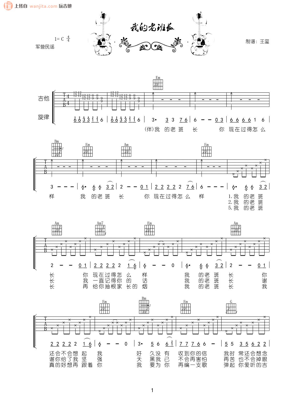 曲谱介绍: 《我的老班长》吉他谱,C调,不使用变调夹,王玺制谱。这首军队民谣相对来说比较简单,适合新手练习学习,一首感人至深的歌曲,送给那些帮助我们的难忘的人。