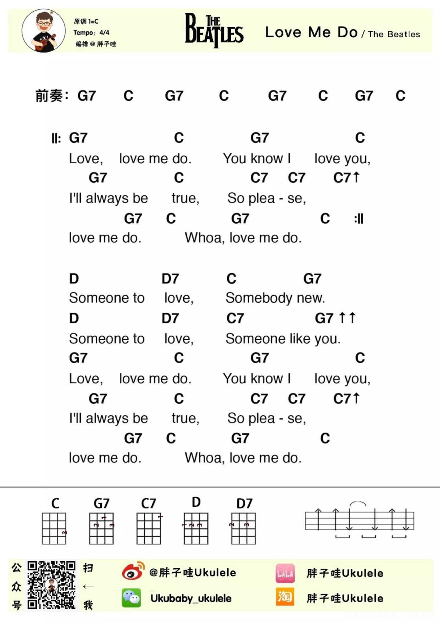 曲谱介绍: The Beatles可以说是流行乐坛上最具盛名的乐队组合,影响了从六十年代至今几乎每一支摇滚乐队的形成和发展。也是子哇最钟爱的乐队! 〈Love Me Do〉是The Beatles(披头士乐队,1956-1970)的第一首单曲,四个怀揣着要登峰造极的音乐梦想的活泼大男孩用欢快的节奏向世界宣布Love me do! 《Love Me Do》副歌部分的”Love,love me do”、”You konw I love you”几乎一致的节奏与旋律,旋律简单,朗朗上口。   分享Youtuber分享的Ukulele弹唱版本,快快找口琴小伙伴一起来合奏!   Love Me Do| 弹唱谱