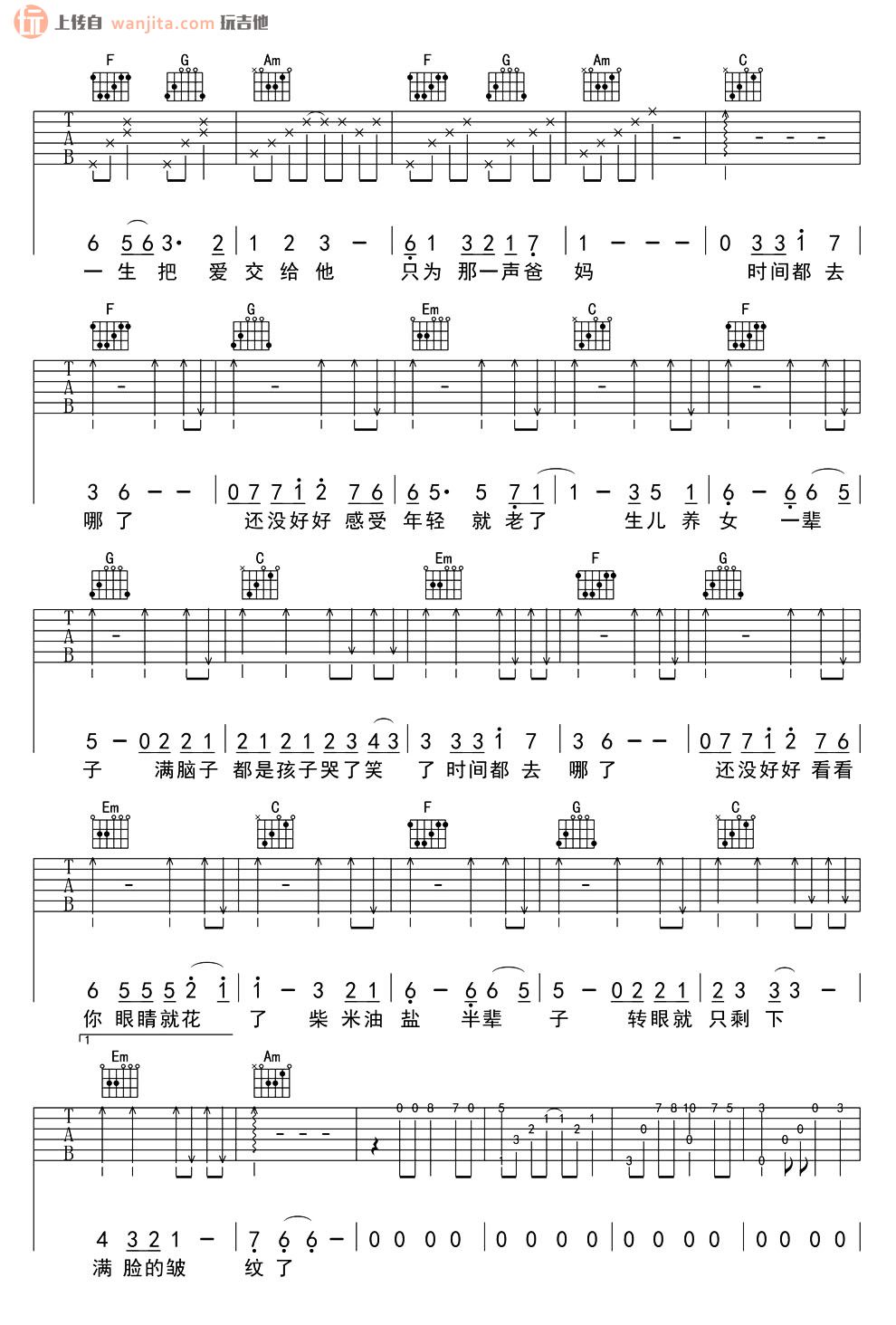 曲谱介绍: 《时间都去哪了》吉他谱,原调C调,使用F调,变调夹夹4品。前奏比较复杂,但十分好听,值得学习弹唱。最精彩也就是这首歌的副歌,让人精神直接到达高潮。很容易流眼泪的歌曲。