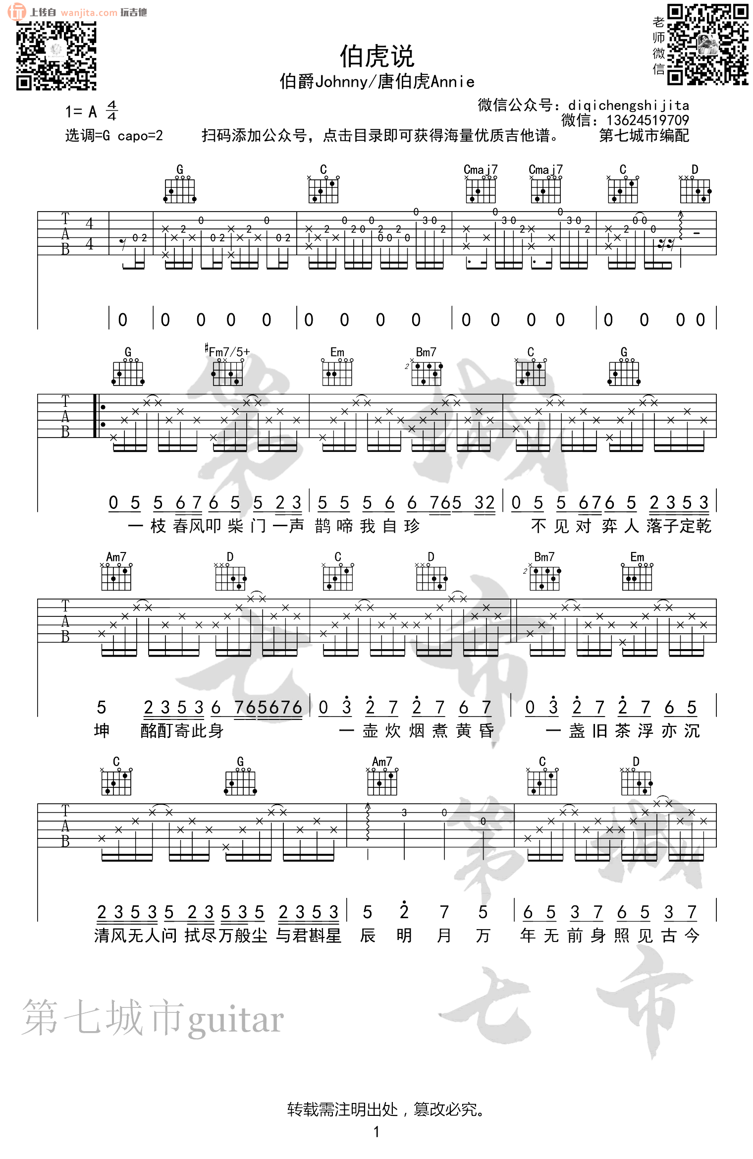 曲谱介绍: 《伯虎说》吉他谱,原调A调,选用G调,不使用变调夹。第七城市编配。整首歌曲难的部分在于唱,一些简单的和弦和容易学习的节奏型让这首歌真正的推广像大众。适合新手学习的歌曲。