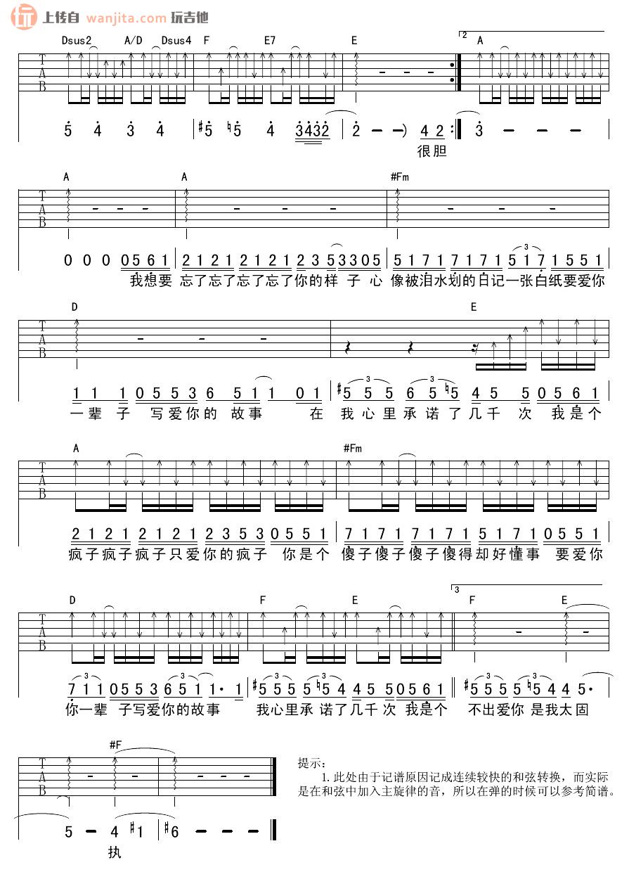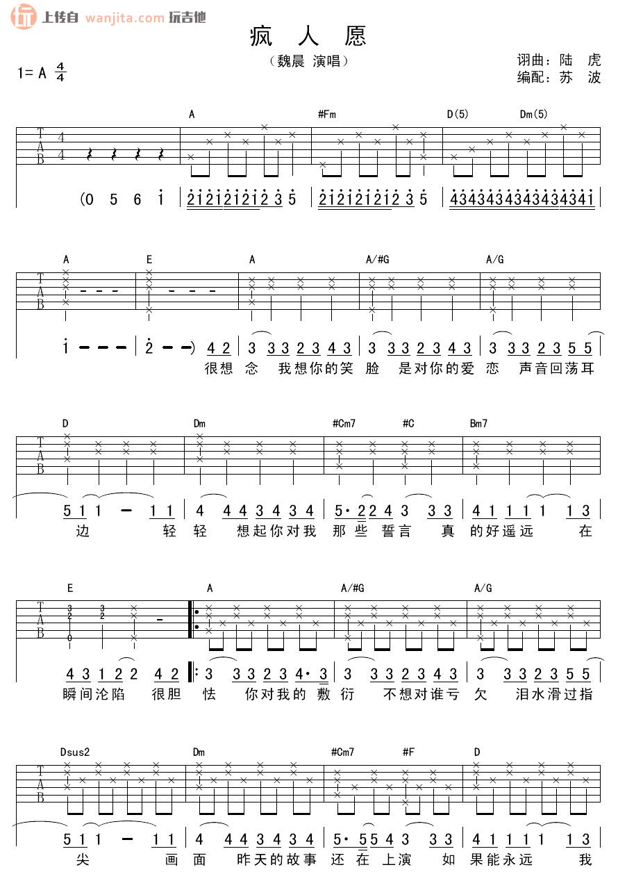 曲谱介绍: 《疯人愿》吉他谱,A调,不使用变调夹,苏波编配。歌曲整体不算难,适合大多数人学习练习。这首歌曲主要表达的是情感,所以吉他能很好地搭配这首歌,很适合吉他弹唱的一首流行音乐。