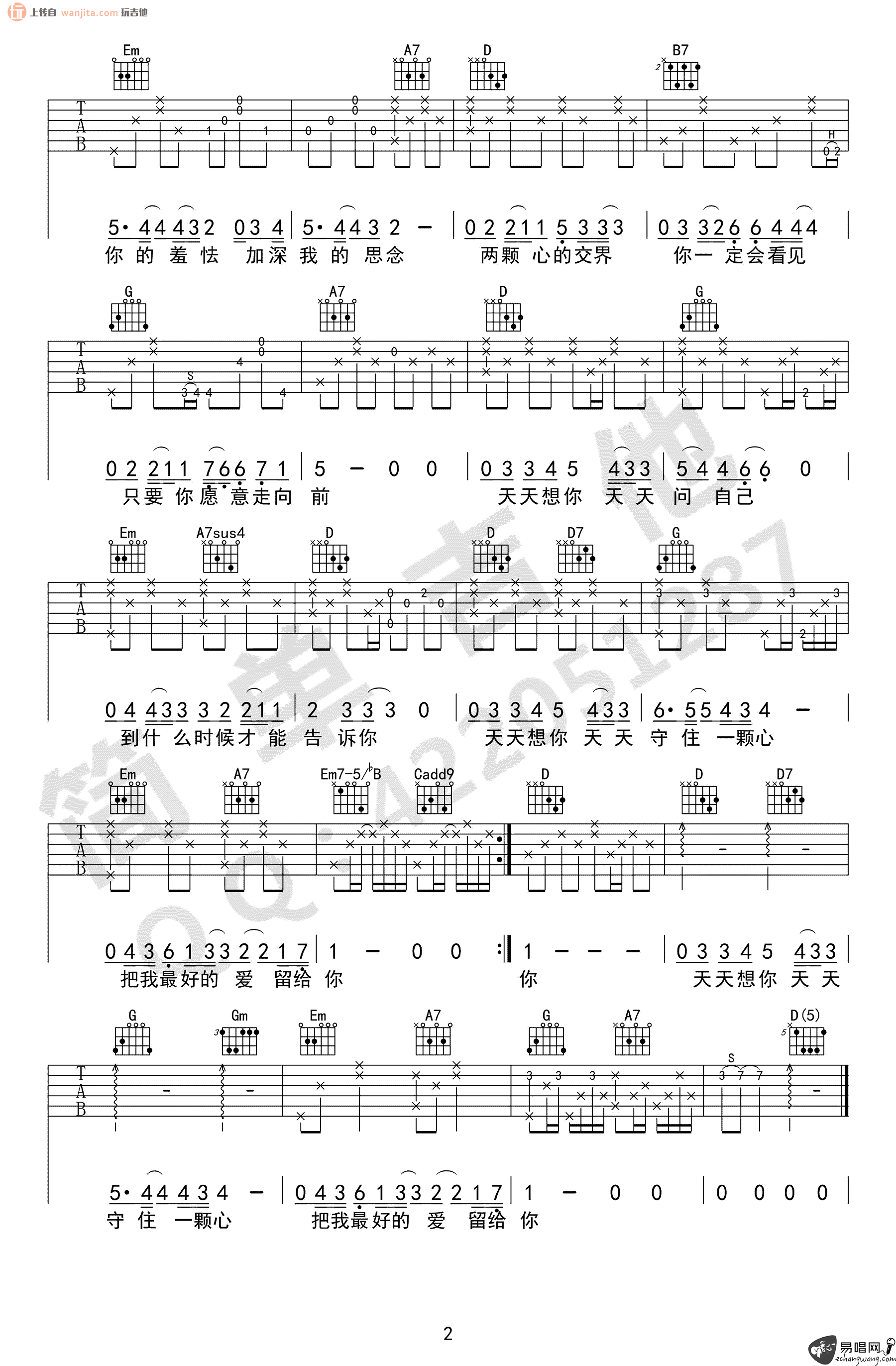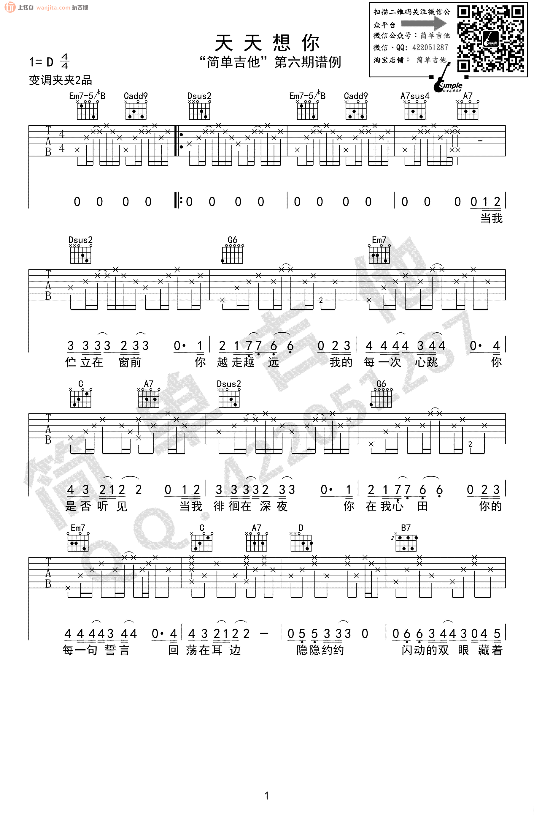 曲谱介绍: 《天天想你》吉他谱,原调D调,变调夹夹2品。整首歌曲谱曲不算难,适合新手学习练习。但是,大家在练习的时候要注意歌曲的情绪起伏,一首好听的情歌记得收藏。