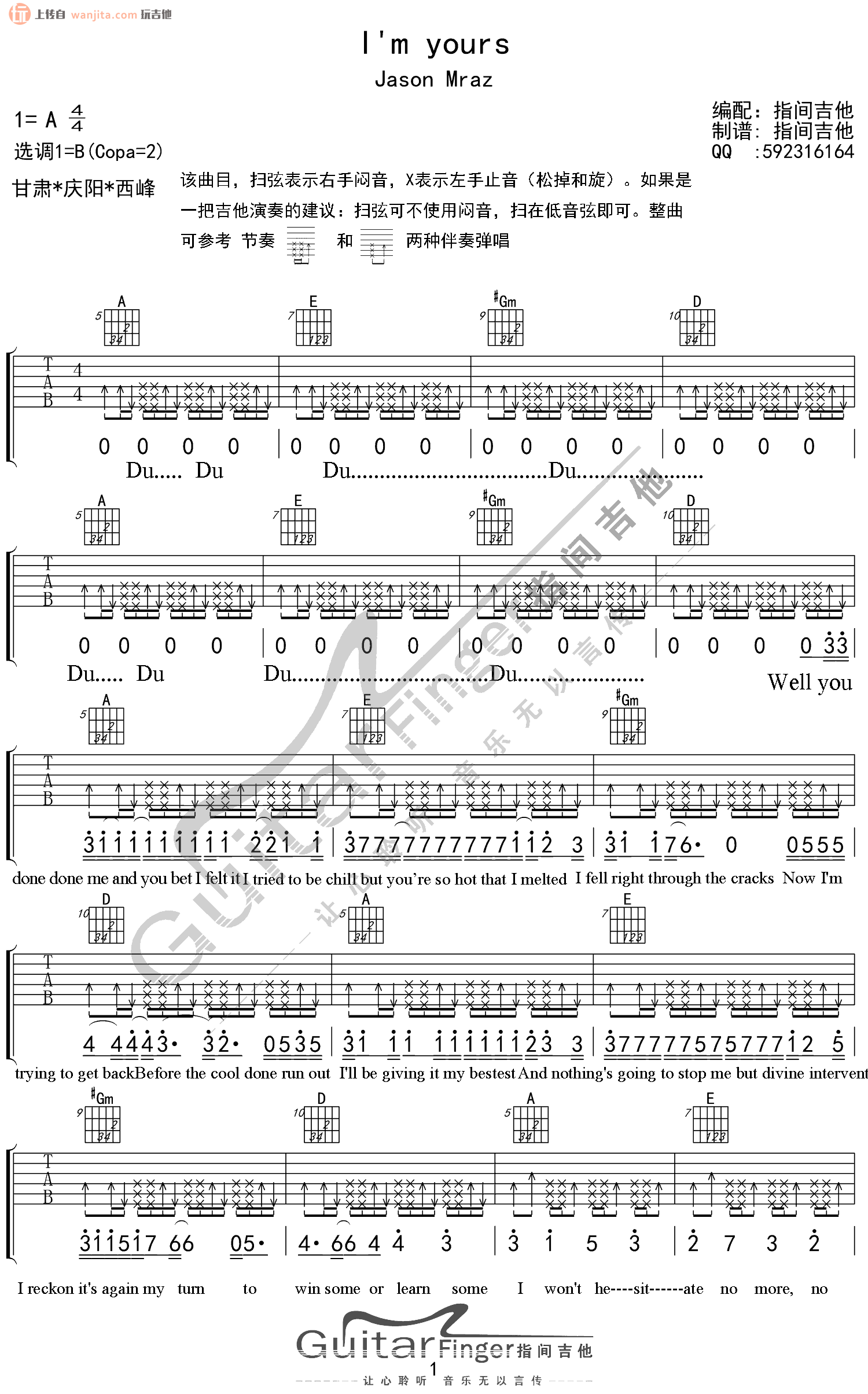 曲谱介绍: 《I'm Yours》吉他谱,原调A调,选用B调,不使用变调夹。整张曲谱最大的特点是右手节奏型的变换,整首歌轻快的风格通过右手的变换被展现的淋漓尽致。这张谱子能够把这首歌的风格更好的演奏出来。所以你一定会喜欢。