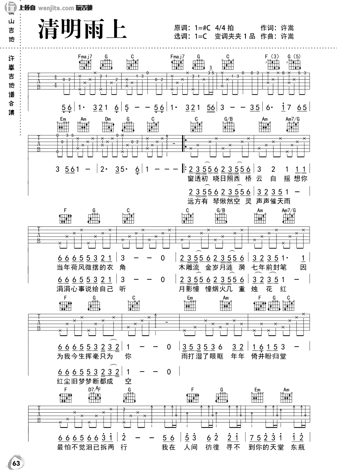 曲谱介绍: 《清明雨上》吉他谱,原调#C,选用C调,变调夹夹1品。整首歌曲通过吉他的演绎更为贴合歌词意境,非常适合吉他弹唱的一首歌曲,曲谱难度一般,适合进阶学习练习。