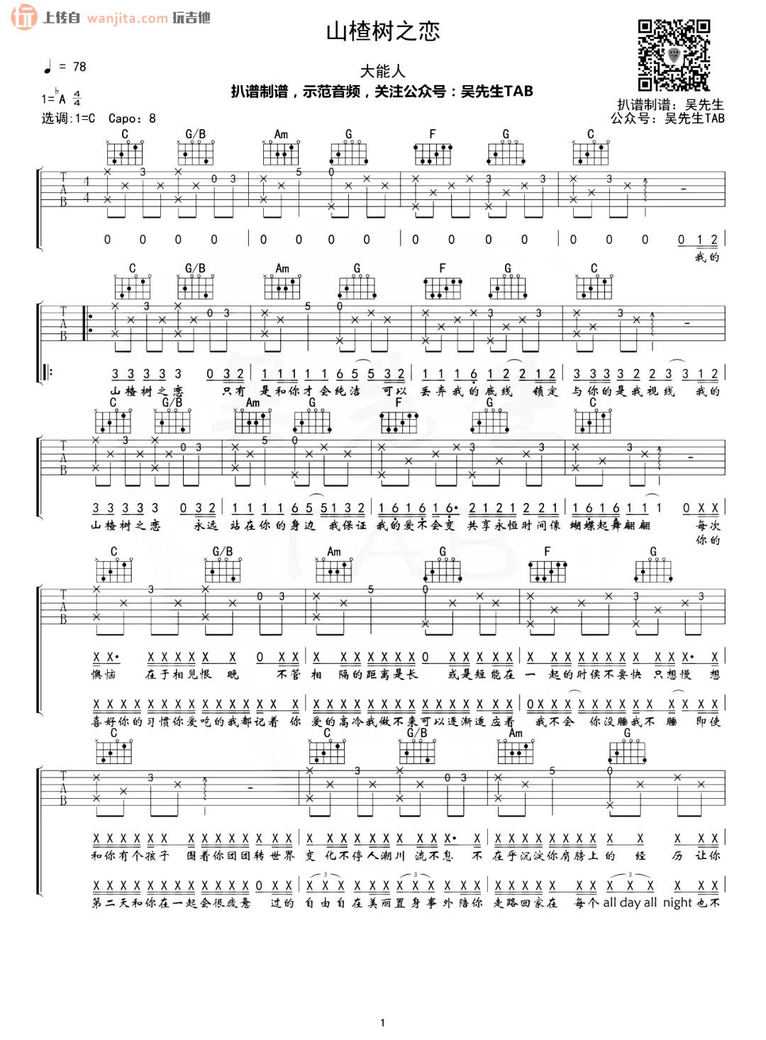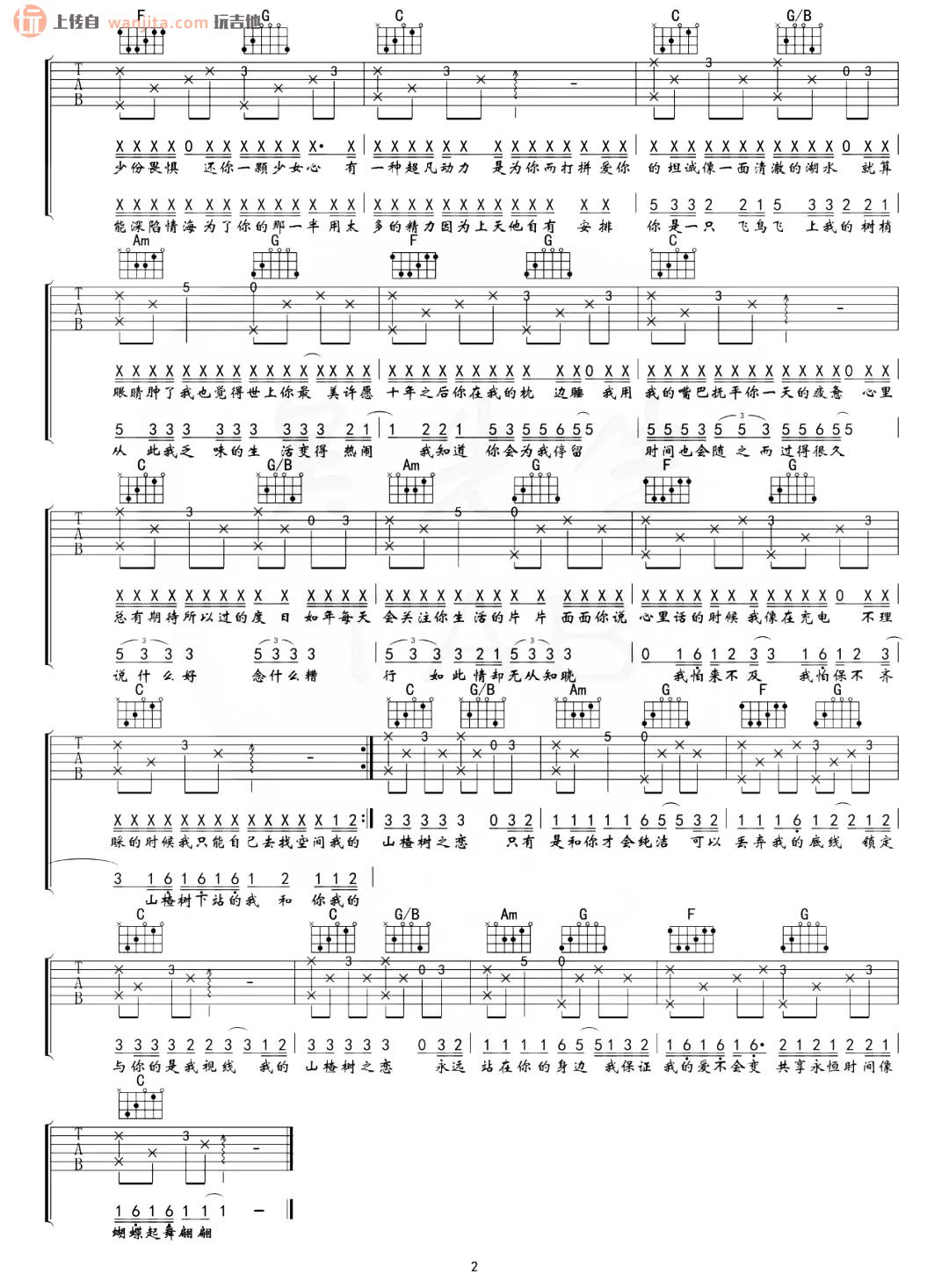 曲谱介绍: 山楂树之恋吉他谱,一首清澈而纯真的情歌。选用C调指法,变调夹Capo夹8品弹唱原调,建议不用夹那么高把位,根据自己音域进行适度上调,弹唱和弦基本上和原版一致,总共2张高清图片谱,感谢吴先生的制谱编配,玩吉他整理上传。