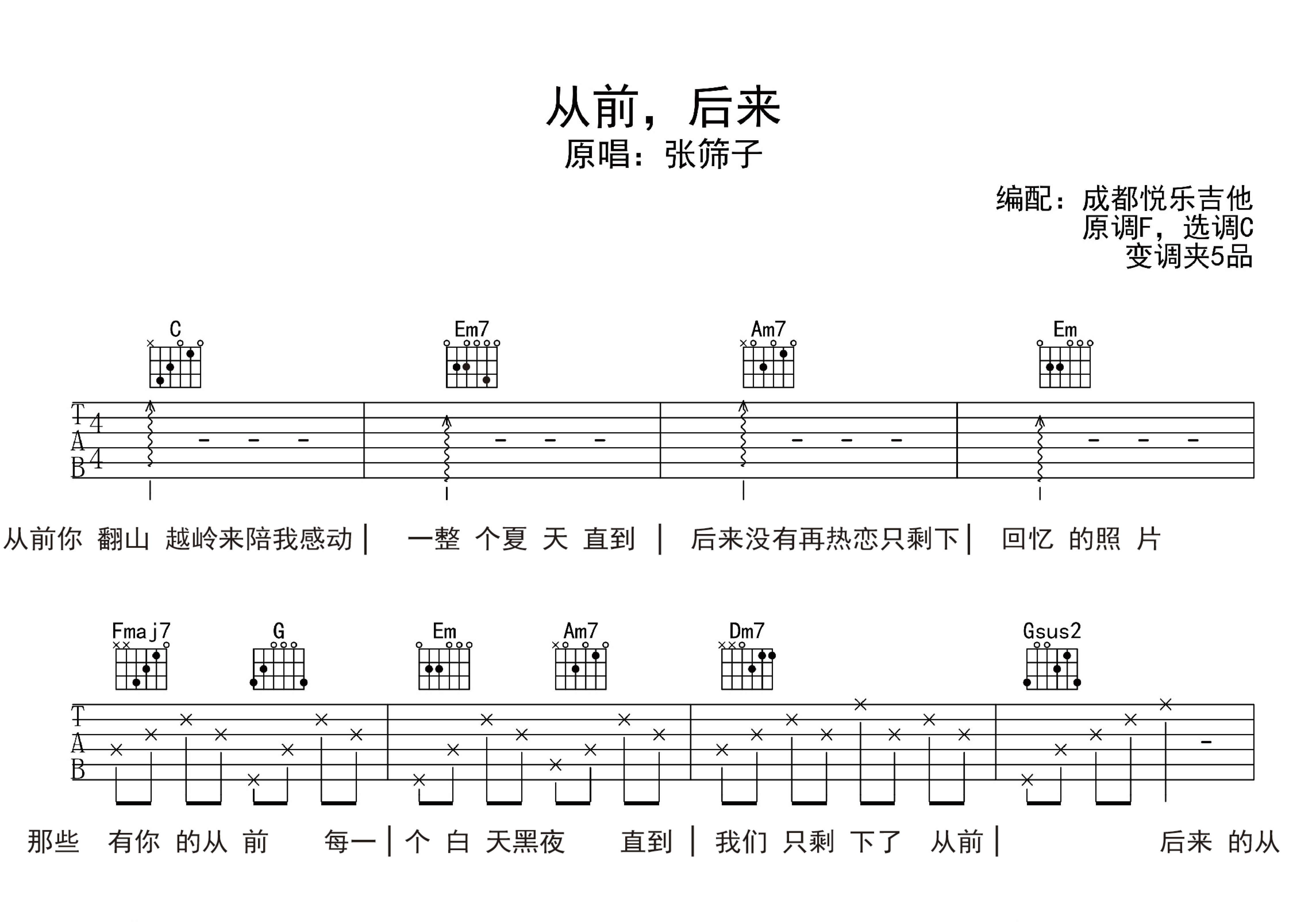 曲谱介绍: 《从前,后来》C调六线谱,总共3张高清图片谱,男生不用调整变调夹,原调是F调,女生只需要将变调夹夹5品处,本首曲谱包含了完整的吉他弹唱视频教学示范,由男声版演示,由悦乐吉他制谱,玩吉他平台原创上传作品,未经允许严禁一切盗取抄袭。 吉他弹唱预览视频: 您的浏览器不支持。