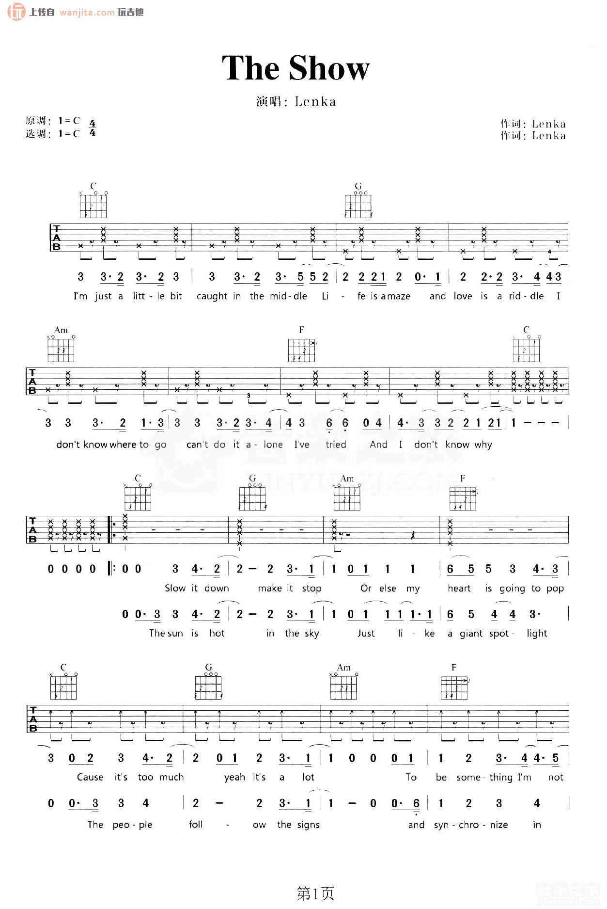 曲谱介绍: The Show吉他弹唱谱,原调C调,选用C调,不使用变调夹。这首《The Show》难度属于中等,适合进阶练习,大家在学习的时候要注意这首歌地间奏和前奏,以及歌词里面的情绪,还是比较难以把握的一首歌曲。