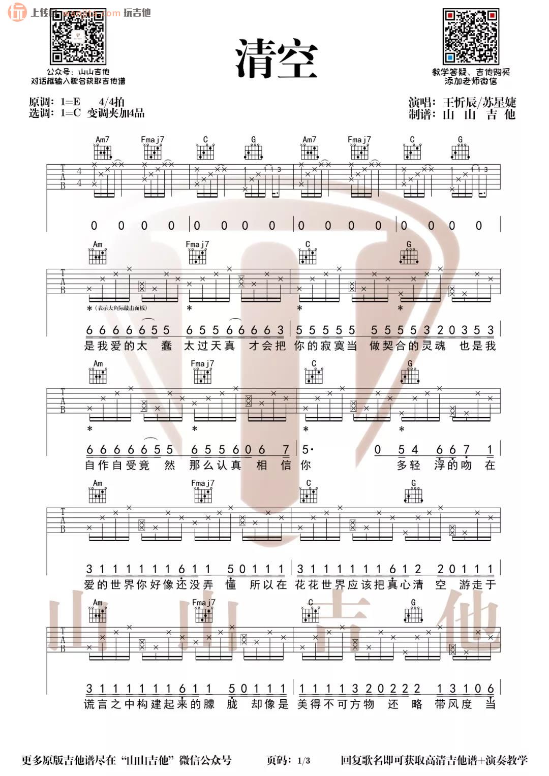 曲谱介绍: 王忻辰/苏星婕《清空》吉他弹唱谱,采用C调指法编配原版,共有3张高清图谱。