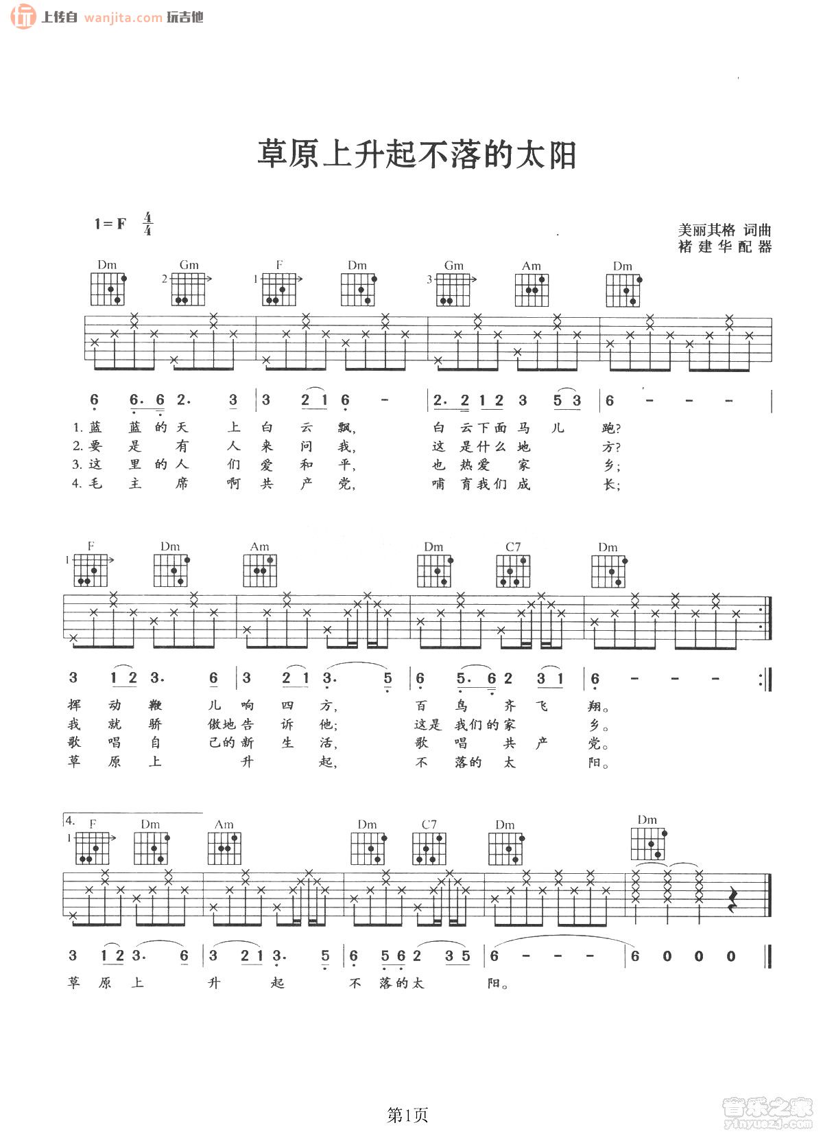 草原上升起不落的太阳吉他谱 - 胡松华 - F调吉他弹唱谱