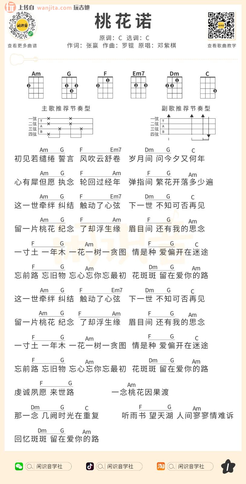 曲谱介绍: 桃花诺吉他和弦谱,原调C调,选用C调。不使用变调夹。这首桃花诺曲谱比较简单,适合新手练习学习,大家学习的时候要注意这首歌曲的意境氛围营造。