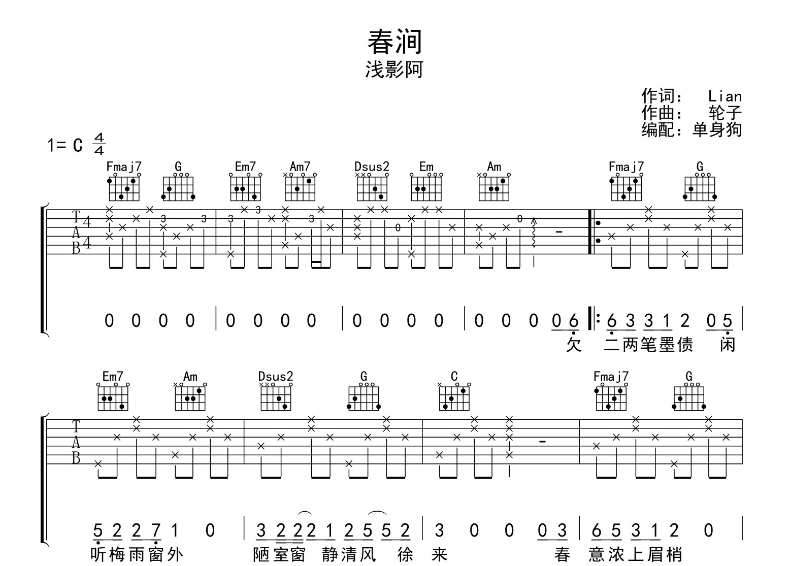 春涧吉他谱 - 浅影阿 - C调吉他弹唱谱