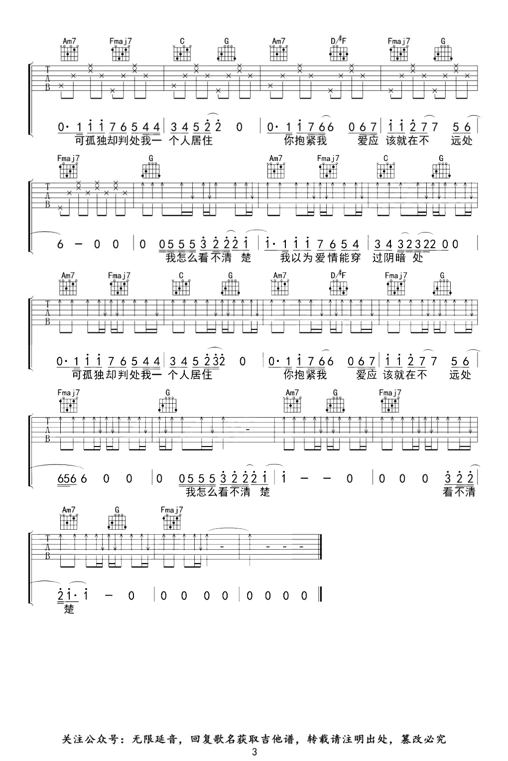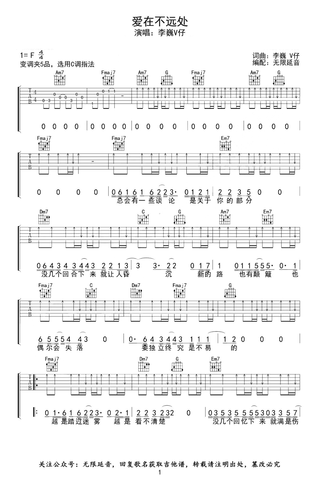 曲谱介绍: 《爱在不远处》吉他弹唱谱,原调F,变调夹夹五品,选用C调指法,三张图片六线谱。
