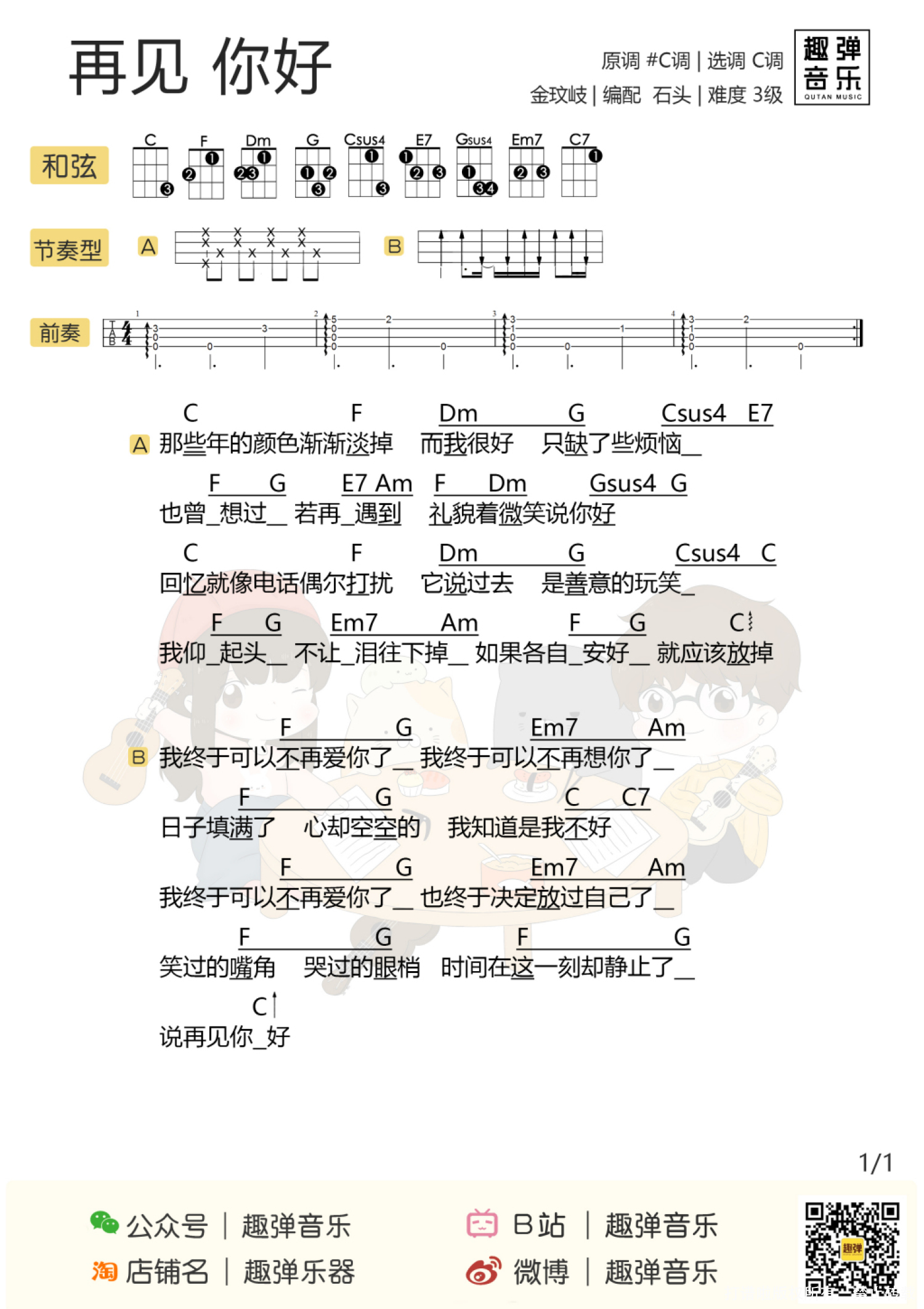 曲谱介绍: 可以单曲循环的睡前曲,听完有一种释然的感觉~ 再见,你好 尤克里里谱