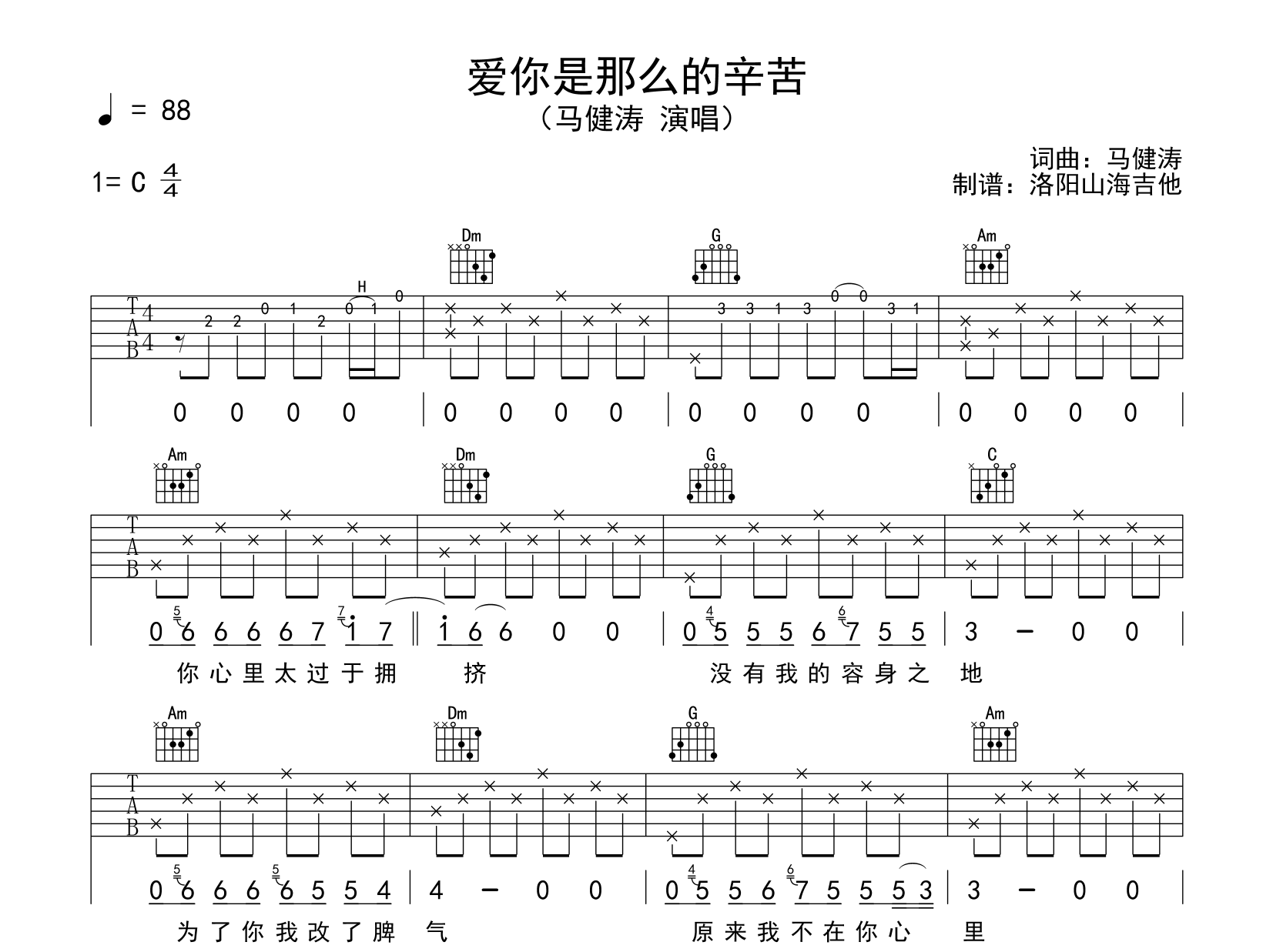 爱你是那么的辛苦吉他谱 - 马健涛 - C调吉他弹唱谱