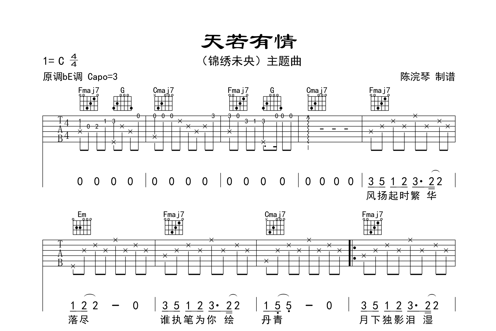 曲谱介绍: 天若有情吉他谱,黄丽玲A-lin演唱的《锦绣未央》主题曲,《天若有情》吉他弹唱谱,共有三张图片谱,选用C调指法编配吉他谱,原调bE,建议变调夹夹3品弹唱,难度初级简单,按原版编配,本谱由@陈浣琴制谱上传。
