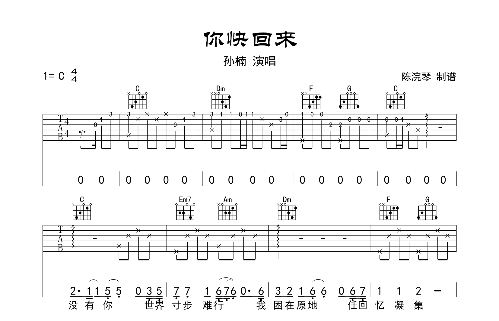 曲谱介绍: 你快回来吉他谱,孙楠的一首成名作,《你快回来》吉他弹唱谱,共有两种图片谱,C调原调编配吉他谱,标准调音可不夹变调夹,包含完整前奏按原版编配,难度初级简单,本谱由@陈浣琴制谱上传。