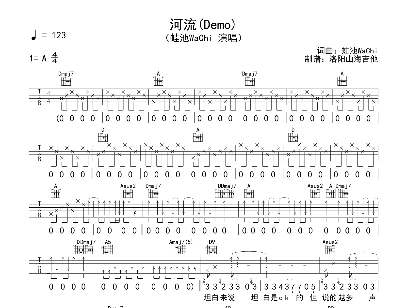 曲谱介绍: 蛙池WaChi《河流》吉他谱,由@飞韵吉他制谱,《河流》吉他弹唱谱,选用A调,共有两张图片谱,原调是A调,标准调音可不用变调夹,速度123BPM,节奏4/4拍,难度初级简单。