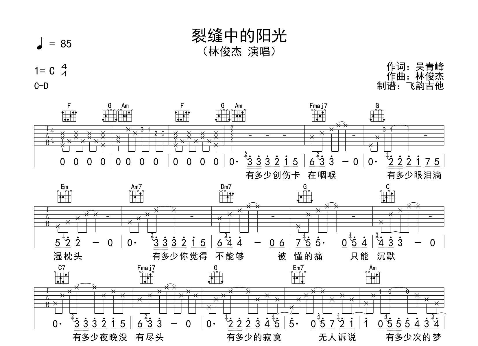 曲谱介绍: 林俊杰《裂缝中的阳光》吉他谱,由@飞韵吉他制谱,《裂缝中的阳光》吉他弹唱谱,共两张图片谱,选用C调指法,节奏4/4拍,速度85BPM,难度初级简单,标准调音,弹唱可根据自己嗓音调整变调夹位置。